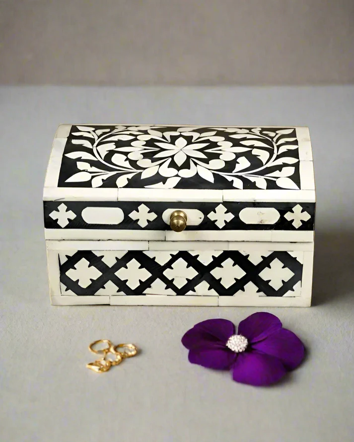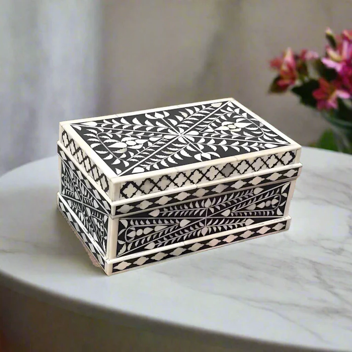 Bone Inlay Rectangular Jewellery Box – Black Floral Decorative Storage Box