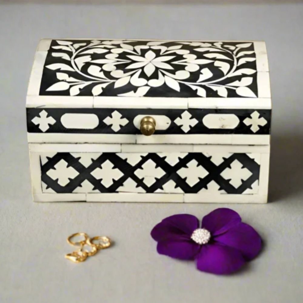 Bone Inlay Rectangular Jewellery Box – Black Floral Decorative Storage Box