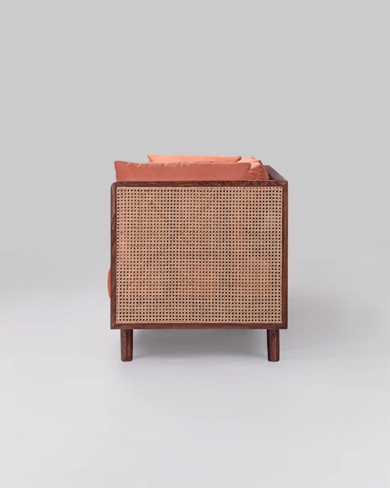 The Auresta 3-Seater Sofa by Art of Rajasthan features handwoven cane work, solid wood framing, and premium fabric upholstery. Available in rich, nature-inspired shades like Terracotta Peach, Cream, Olive Green, Mustard Yellow, Peacock Blue, and Rust Camel — it brings warmth, style, and artisanal comfort to any modern living space.