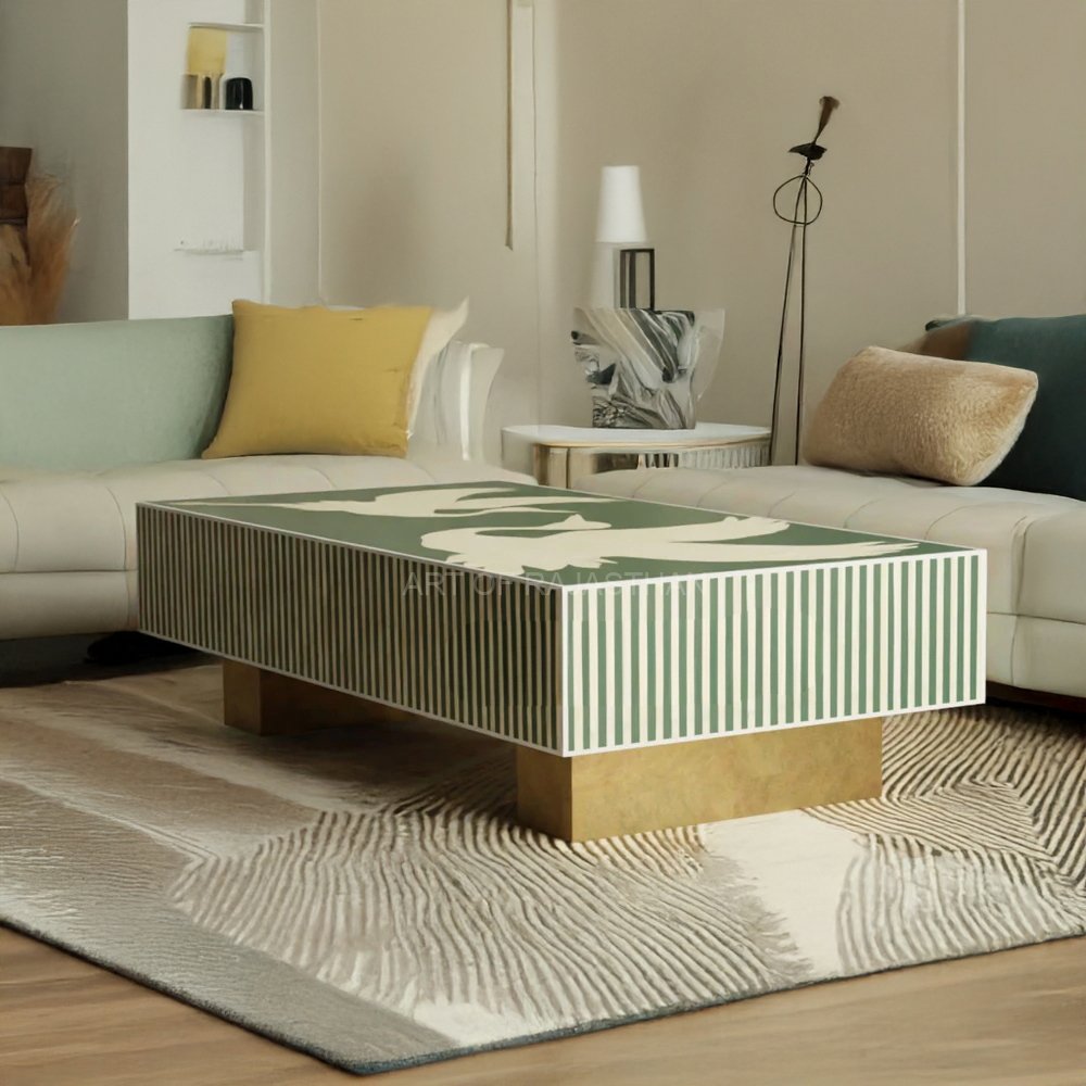 Soar into elegance with the Bone Inlay Rectangular Coffee Table – Birds Wing. Handcrafted in rich emerald green by Art of Rajasthan, this captivating piece showcases intricate bone inlay work inspired by the graceful form of bird wings. Measuring 130 × 70 × 40 cm, it blends artisanal craftsmanship, bold design, and natural beauty, making it a luxurious centerpiece that adds movement, depth, and sophistication to any living space