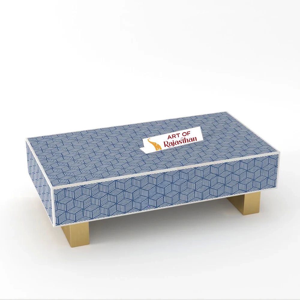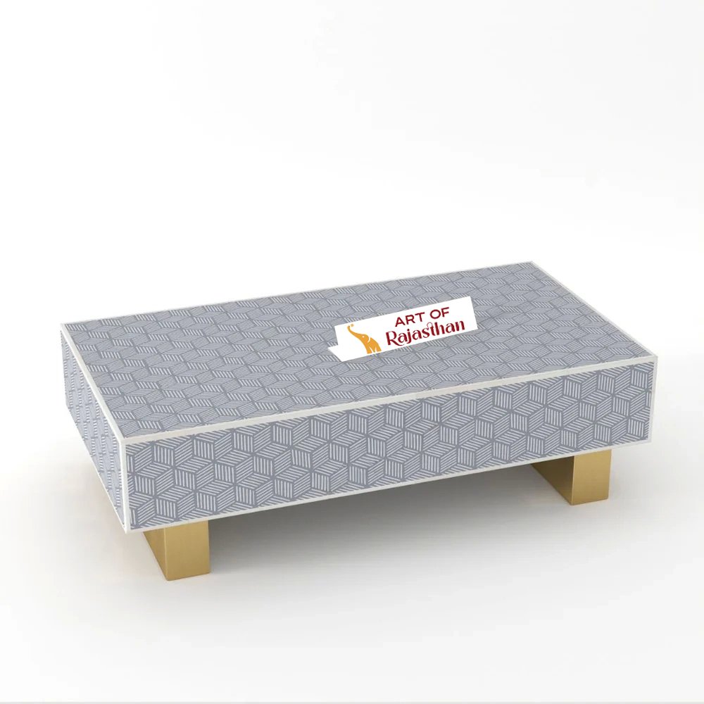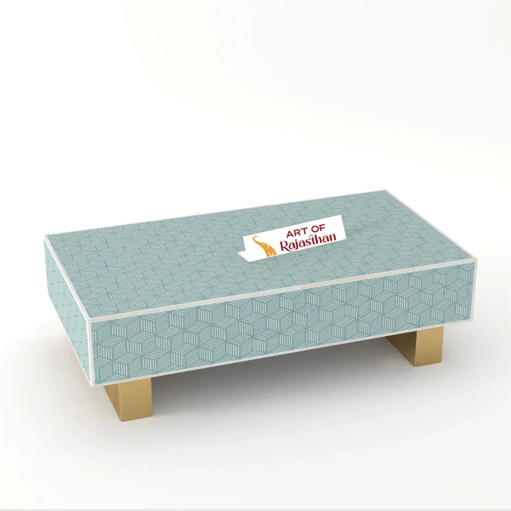 Add modern elegance with the Bone Inlay Rectangular Coffee Table – Geo. Handcrafted by Art of Rajasthan, this stunning table features a bold geometric design created with bone inlay and mother of pearl. Available in striking colors like Black, Teal Blue, Teal Green, Grey, and Indigo, it measures 130 × 70 × 40 cm, making it the perfect luxury centerpiece for your living room. Sophisticated, artistic, and timeless, this table is a true expression of modern craftsmanship.