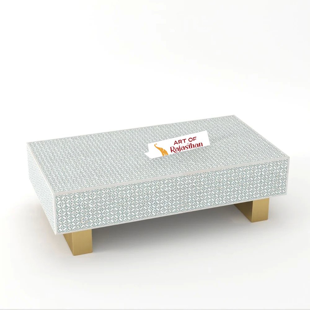 Infuse your space with artistic allure using the Bone Inlay Rectangular Coffee Table – Geometric Floral. Handcrafted by Art of Rajasthan, this exquisite piece blends bone inlay and shimmering mother of pearl into a stunning geometric floral pattern. Available in elegant shades of Black, Teal Blue, Teal Green, Grey, and Indigo, its 130 × 70 × 40 cm structure brings bold color, intricate craftsmanship, and timeless sophistication to any living room. A luxurious centerpiece that celebrates tradition and design.