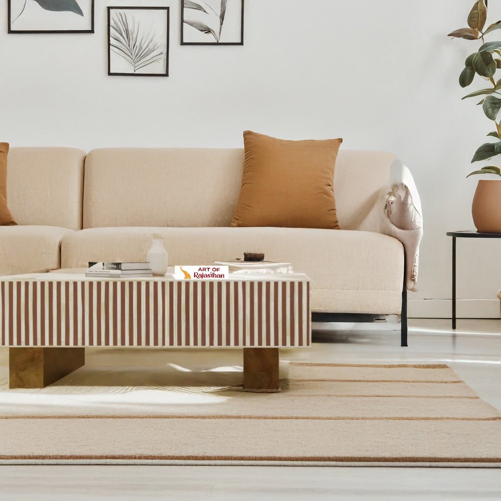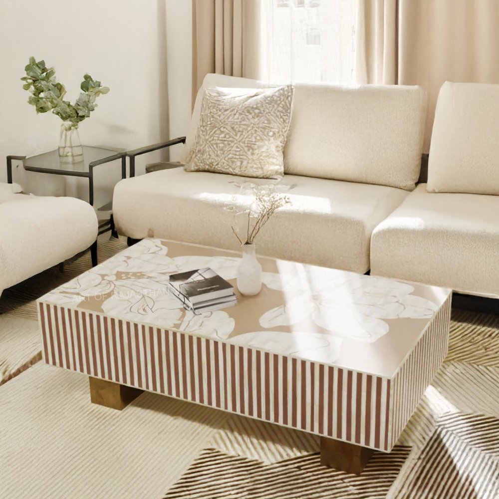 Bring natural elegance into your home with the Bone Inlay Rectangular Coffee Table – Hibiscus Flower. Handcrafted by Art of Rajasthan, this stunning beige & brown piece features intricate bone inlay and mother of pearl arranged in a delicate hibiscus floral pattern. Measuring 130 × 70 × 40 cm, it radiates warmth, artisanal charm, and timeless beauty, making it the perfect centerpiece for sophisticated interiors. A true work of art that speaks of heritage and luxury.