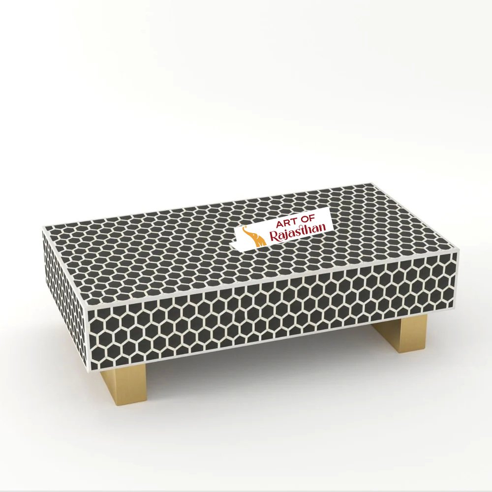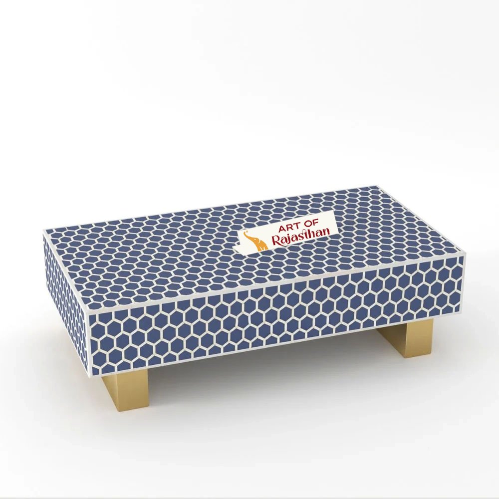 Illuminate your space with the Bone Inlay Rectangular Coffee Table – Honeycomb. Masterfully handcrafted by Art of Rajasthan, this luxurious table features a striking honeycomb pattern crafted from bone inlay and mother of pearl. Available in sophisticated shades like Black, Teal Blue, Teal Green, Grey, Indigo, and White, its 130 × 70 × 40 cm size makes it the perfect statement piece. A blend of contemporary design, exquisite craftsmanship, and timeless elegance—elevate your home with the Honeycomb table today.