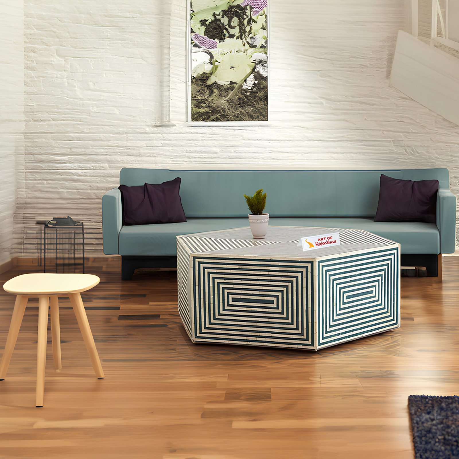 Add a touch of elegance to your space with the Bone Inlay Hexagonal Coffee Table – Green Geometric by Art of Rajasthan. Crafted from premium bone inlay and mother of pearl, this stunning table features a bold green geometric design that enhances any modern or traditional setting. With a spacious 36″ x 42″ dimension, it’s perfect for both functionality and style. Each piece is handcrafted with care, offering a unique, luxurious accent to your living room. H: 17″ Inches.