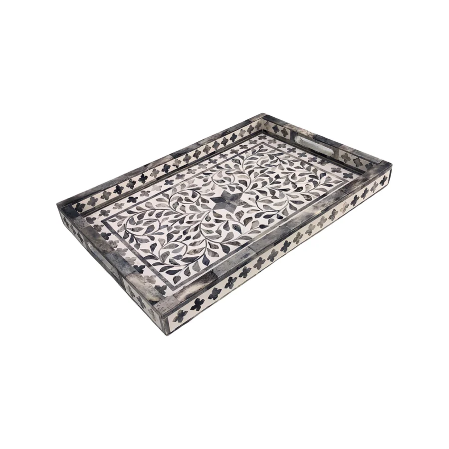 Bone Inlay Rectangular Serving Tray – Grey Floral Design Decorative Tray