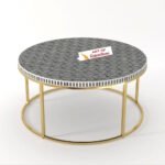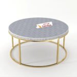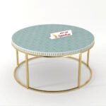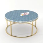 Bring bold elegance to your space with the Bone Inlay Round Coffee Table with Metal Stand – Geo. Handcrafted by Art of Rajasthan, this stunning piece features a sharp Geo pattern in luxurious bone inlay and mother of pearl, beautifully accented with resin and brass detailing. Available in 36″ and 42″ widths and rich colors like Classic Black, White, Grey, Teal Green, Teal Blue, and Indigo, this 17″ high table is a perfect fusion of heritage craftsmanship and modern design—a true showstopper for your living room.