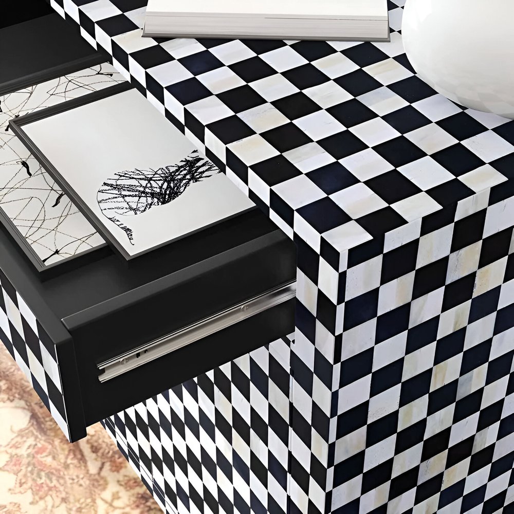 Make a striking style statement with the Checkerboard Bone Inlay Sideboard by Art of Rajasthan. Featuring a bold black and white checkerboard pattern, this piece is meticulously handcrafted using bone inlay, mother of pearl, and premium resin, all set in durable engineered wood with refined brass accents. Compact yet impactful (L150 x D40 x H80 CM), it offers stylish storage and a modern-meets-classic aesthetic that instantly transforms any space. This monochrome marvel is more than furniture — it’s functional art.