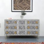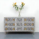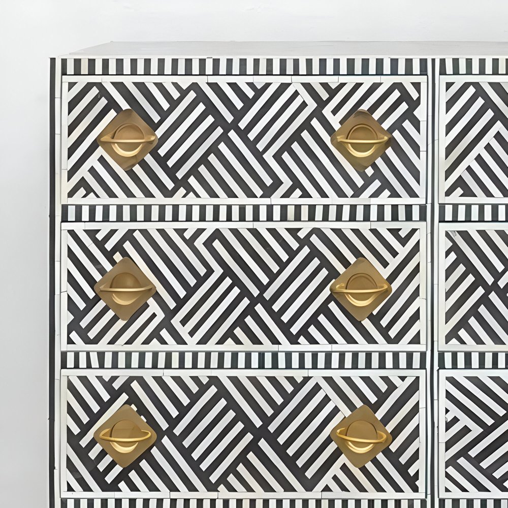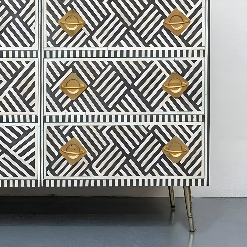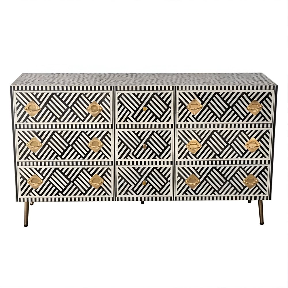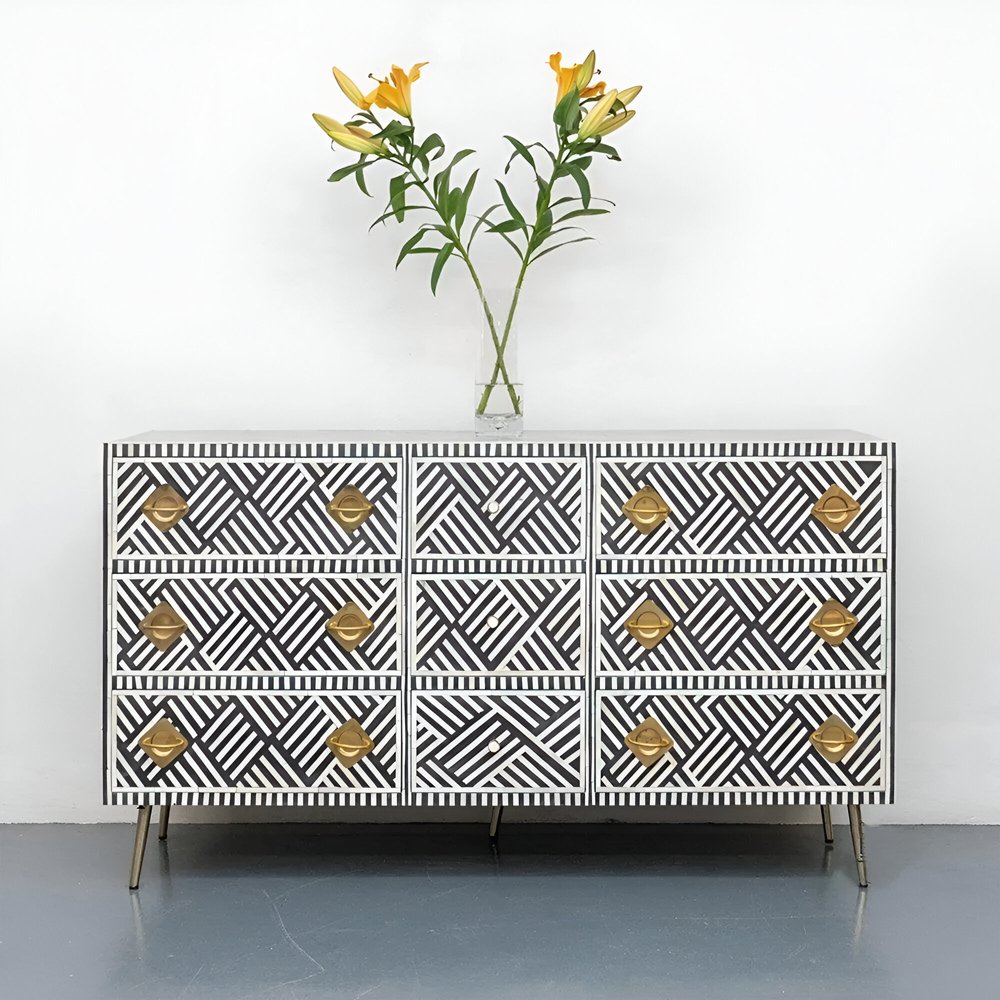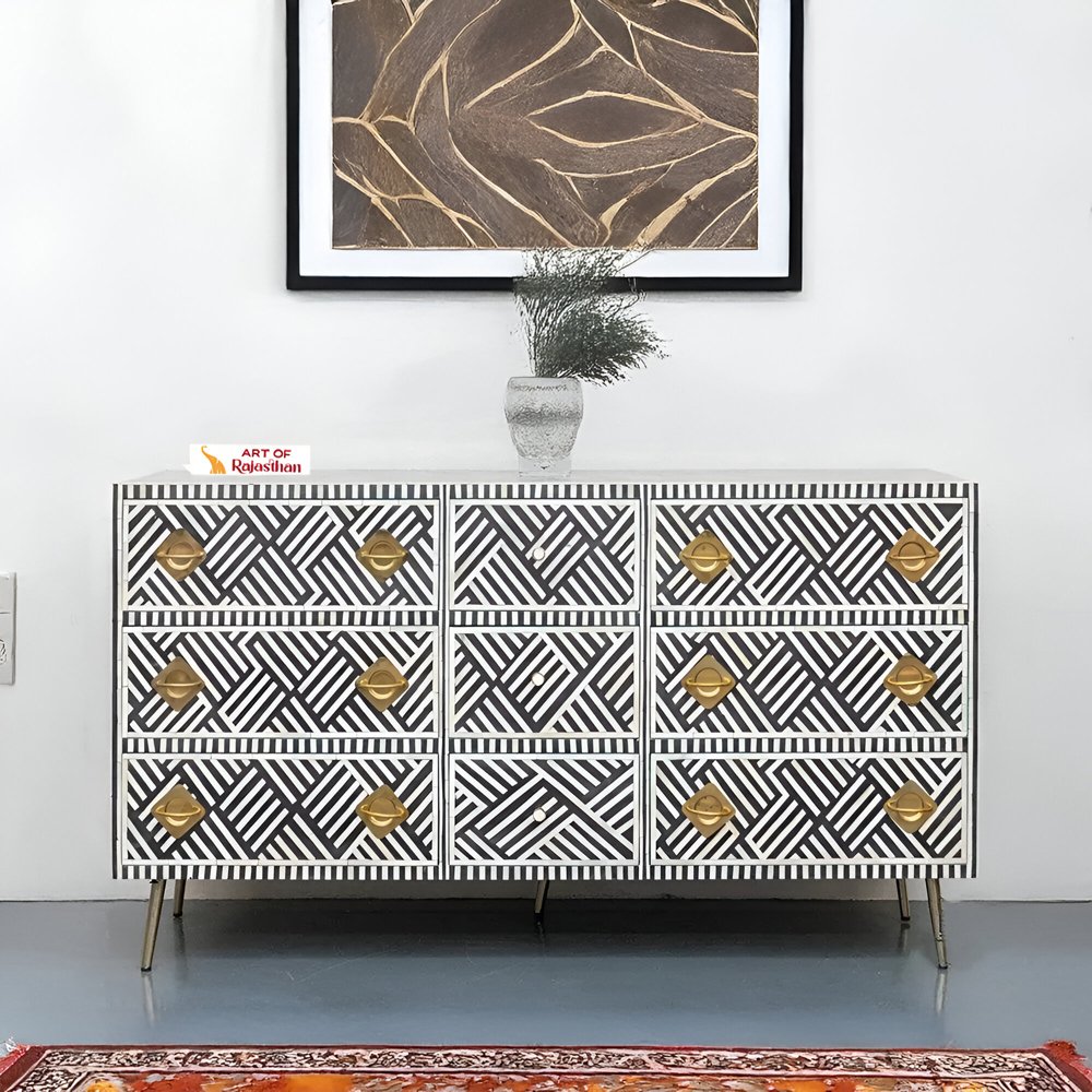 Make a statement with the Chevron Bone Inlay Sideboard from Art of Rajasthan. Featuring a striking chevron pattern in classic black and white, this handcrafted masterpiece adds sophistication and drama to any room. Expertly crafted with bone inlay, mother of pearl, and finished with gold accents, this sideboard offers the perfect blend of elegance and functionality. The engineered wood frame and brass hardware ensure long-lasting durability, while the L177 x D45 x H84 cm dimensions provide ample storage with style.