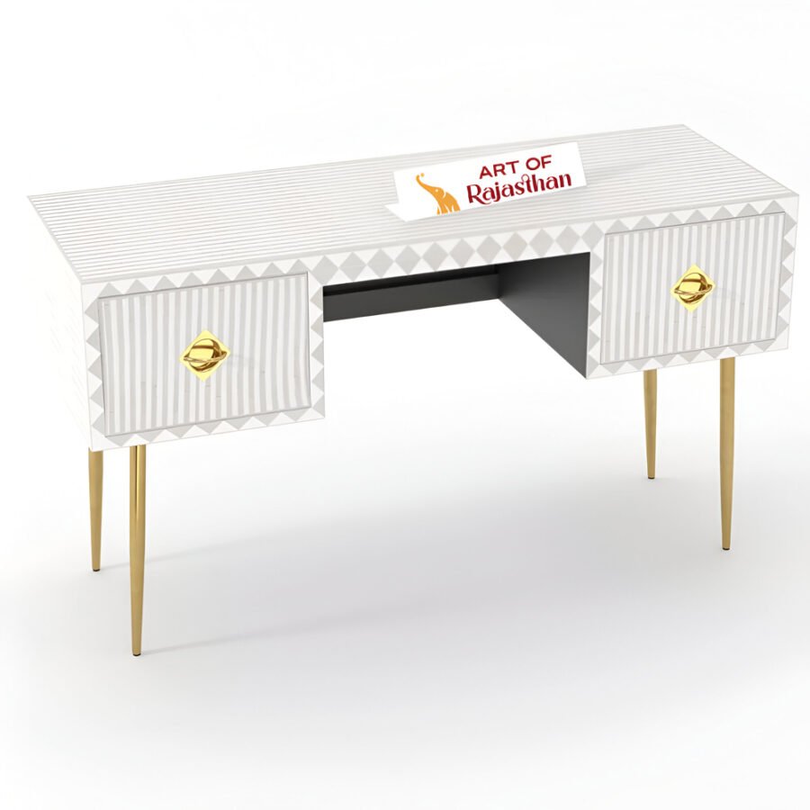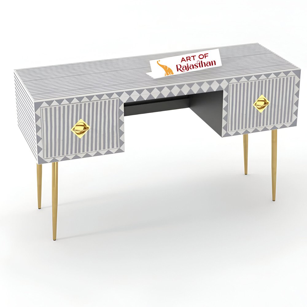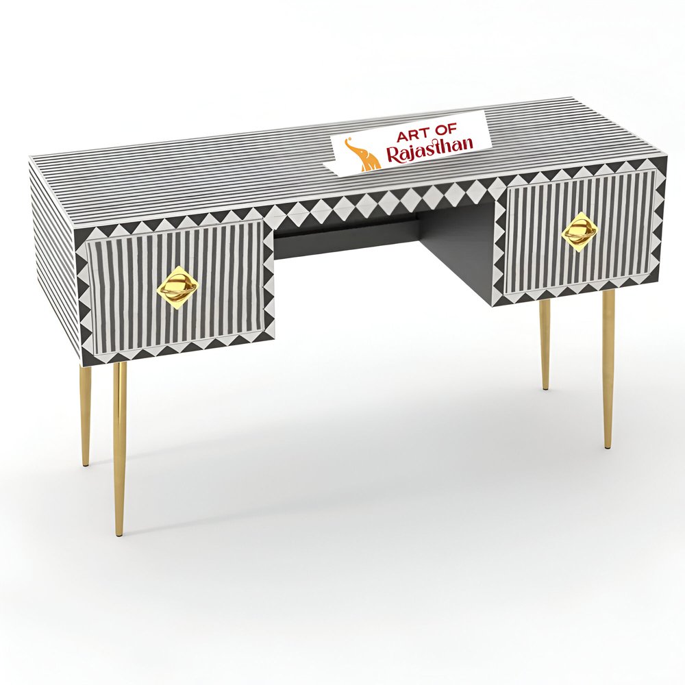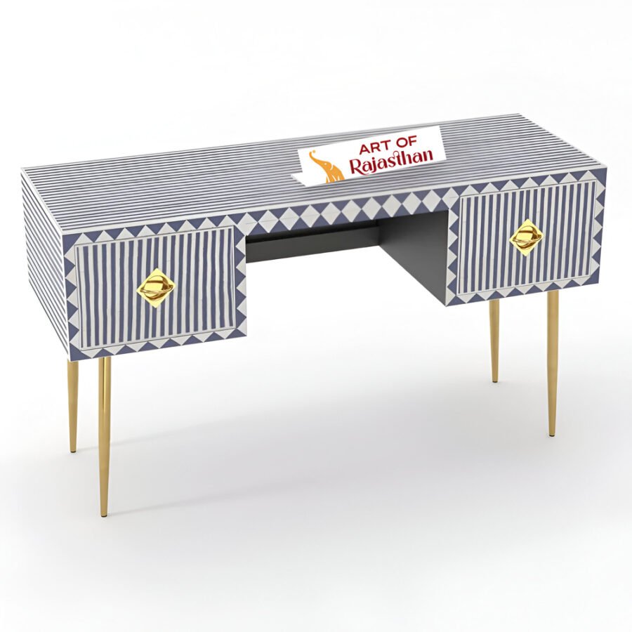 Let your workspace flow with elegance through the Bone Inlay Study Table – Waterfall by Art of Rajasthan. Expertly handcrafted, this statement piece features cascading bone and mother of pearl inlay patterns, beautifully layered in a blend of classic black, white, grey, teal green, teal blue, and indigo hues. With its generous L135 x D50 x H75 CM frame, this desk combines everyday functionality with artistic grandeur. Each swirl and curve evoke the soothing rhythm of flowing water—bringing calm, inspiration, and beauty to your space. Crafted using premium resin, bone inlay, and mother of pearl, this desk is a timeless fusion of luxury and tradition.