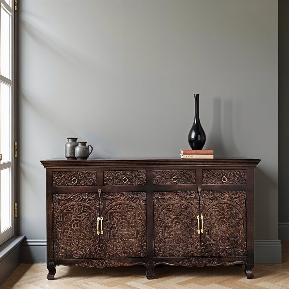 Hand Carved Mango Wood Sideboard | Walnut Finish Cabinet