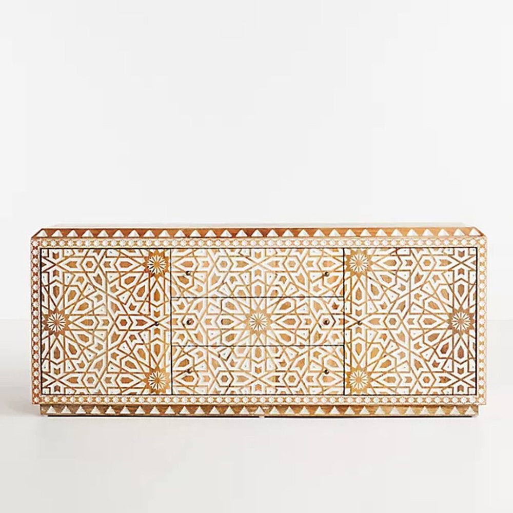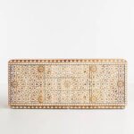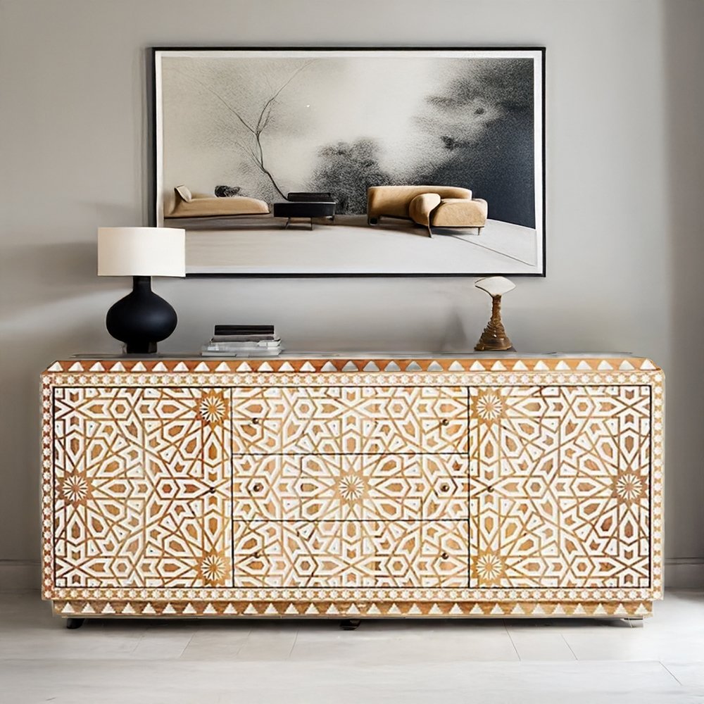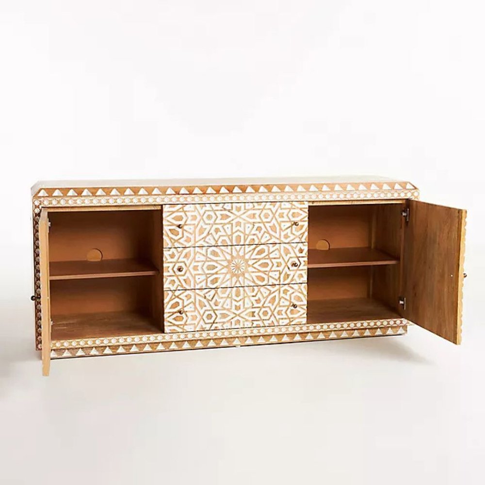 Bring timeless artistry and practical storage into your home with this hand carved solid wood sideboard featuring 2 doors and 3 drawers. Meticulously handcrafted by skilled artisans, this sideboard showcases intricate geometric carvings that add elegance, texture, and character to any interior space.