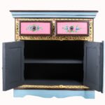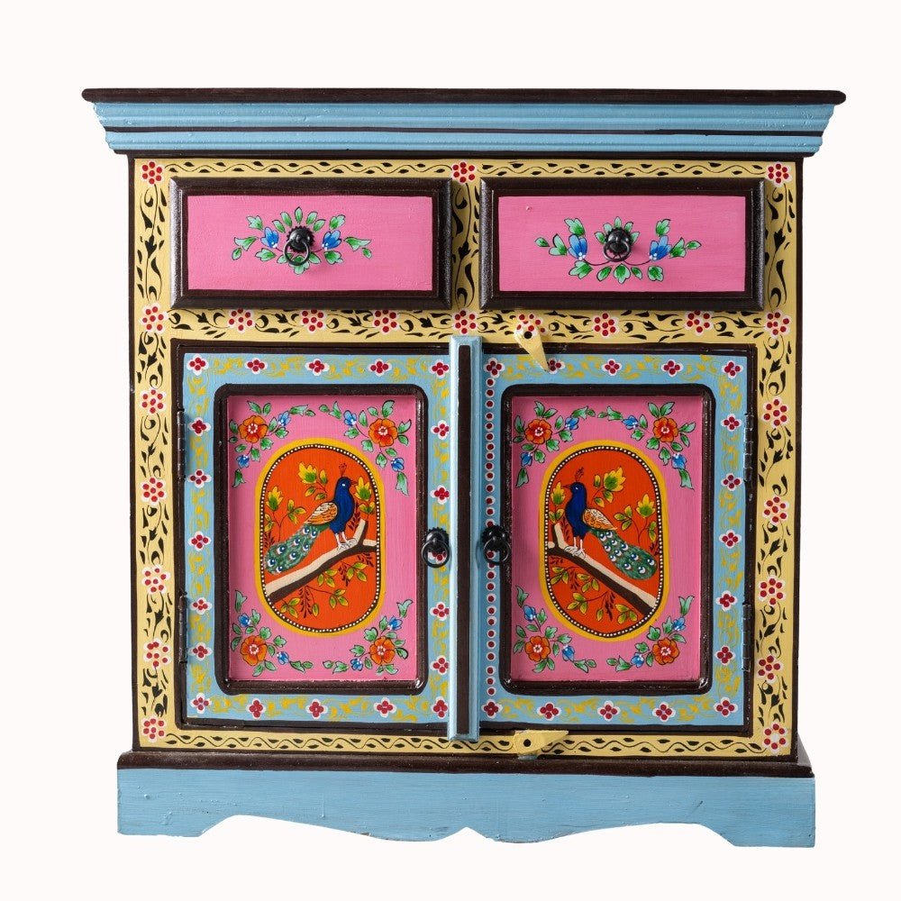 Made from high-quality solid wood, it includes two drawers and a spacious double-door storage section, making it ideal for organizing essentials while enhancing your décor. Each piece is painted by skilled Indian artisans, preserving the heritage of Rajasthani folk art.