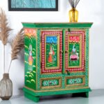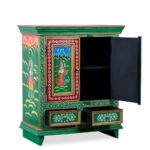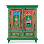 Bring the beauty of Indian heritage into your home with this hand-painted Rajasthani wooden cabinet, featuring vibrant traditional artwork on a rich green base. Each panel showcases detailed miniature-style paintings of royal figures, highlighted with bold red, gold, and white borders that reflect authentic Rajasthan craftsmanship.