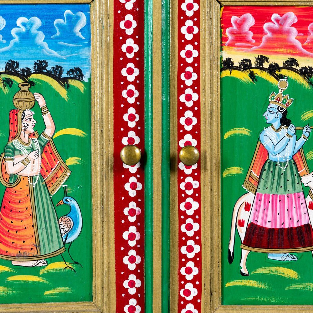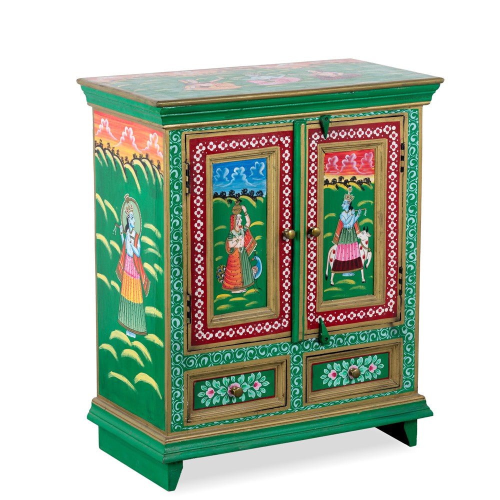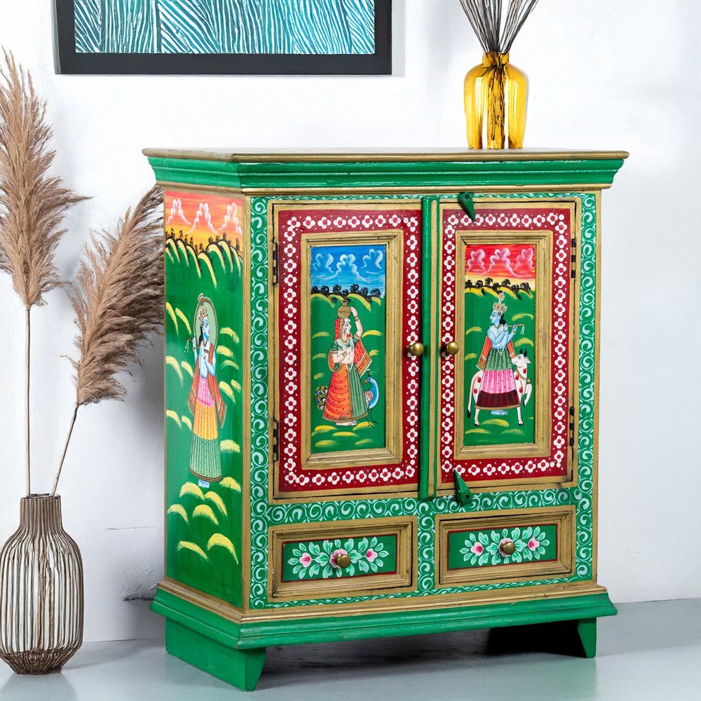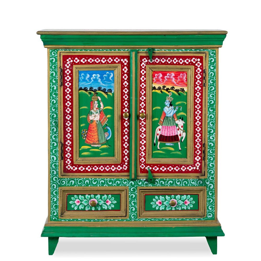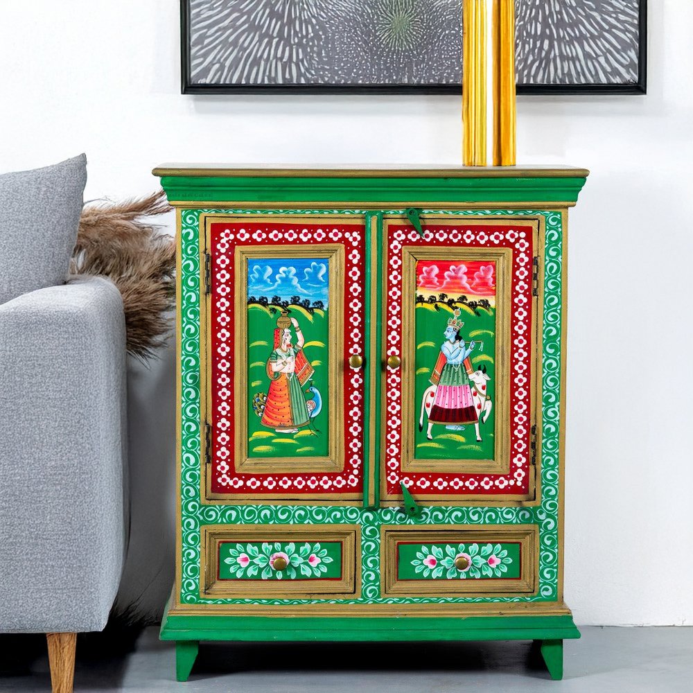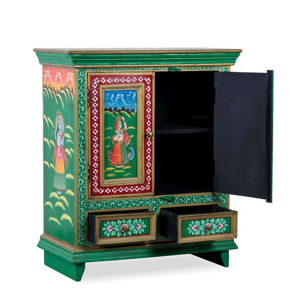 Hand-Painted Rajasthani Radha Rani Mango Wood Cabinet-2 Door and 2 Drawer | Traditional Artwork Unit