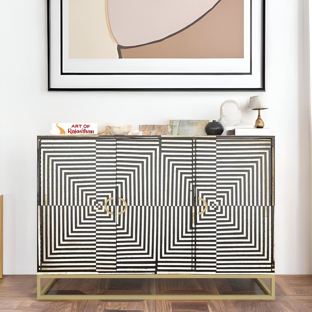 Elevate your interiors with the Bone Inlay 2 Door Storage Cabinet – Optical Illusion by Art of Rajasthan. Handcrafted to perfection, this striking piece features intricate bone inlay and mother of pearl detailing, set in a bold black & white geometric pattern that mesmerizes the eye. The luxurious gold base adds a rich contrast, exuding opulence and charm. With its generous dimensions (L150 x D50 x H85 CM), this cabinet offers both style and smart storage, making it perfect for living rooms, hallways, or bedrooms. Made from premium resin, engineered wood, and brass, it’s a lasting investment in timeless Indian craftsmanship. Statement Piece. Handmade Luxury. Functional Art