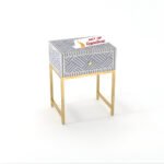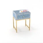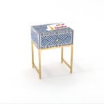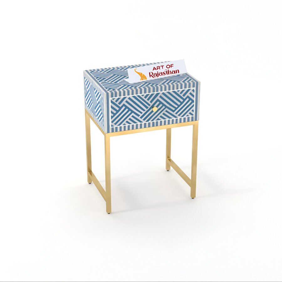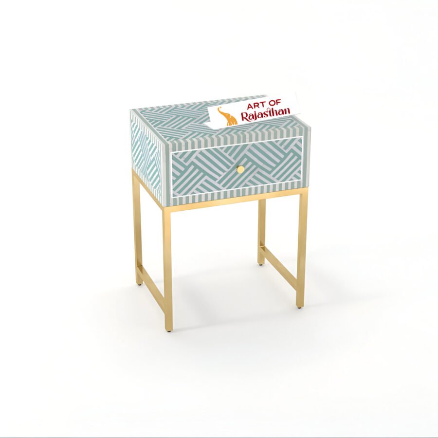 Transform your space with the Bone Inlay Beside Table with Metal Legs – Chevron by Art of Rajasthan. Featuring a chic chevron pattern crafted with fine bone inlay and mother of pearl, this table combines traditional artistry with modern design. The high-quality materials, including resin and metal legs, ensure durability and style. Available in sophisticated colors—Black, Grey, Teal Green, Teal Blue, and Indigo—this piece is perfect for enhancing any room. Dimensions: L 45 x D 35 x H 60 cm. A timeless addition to your home decor.