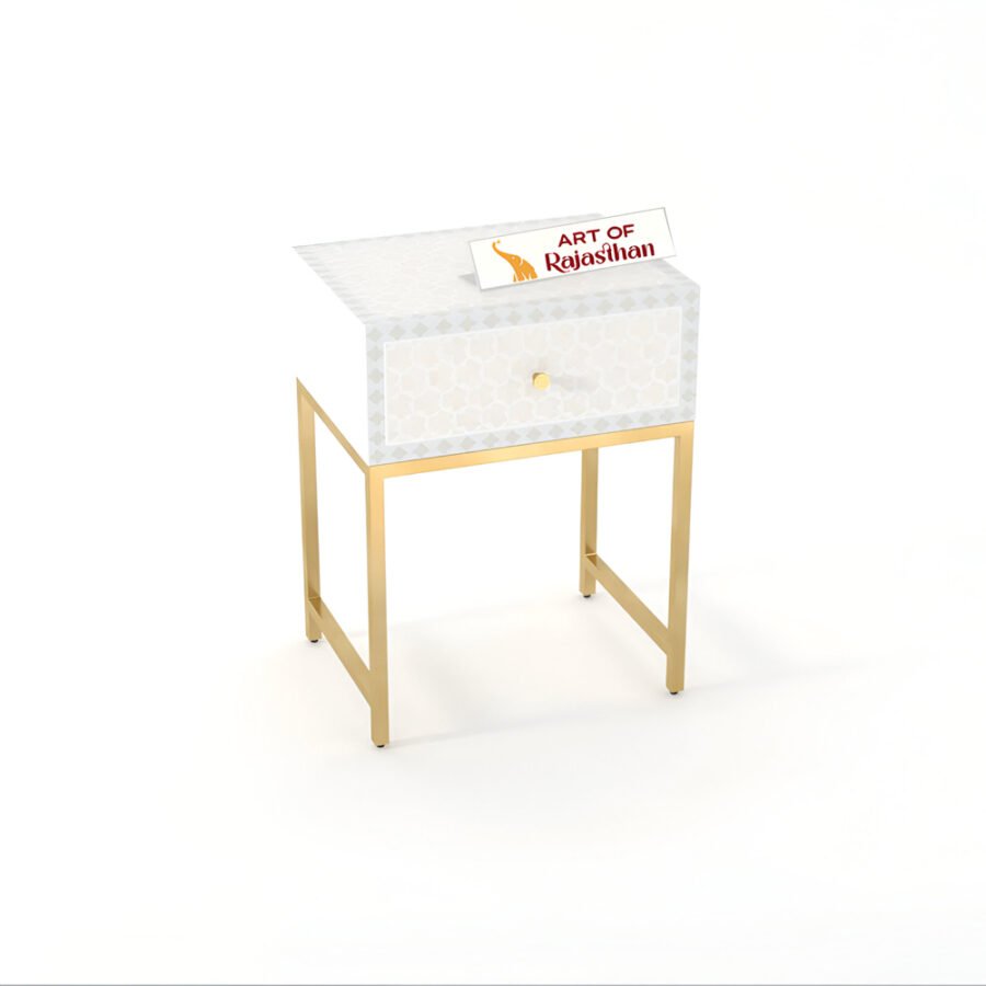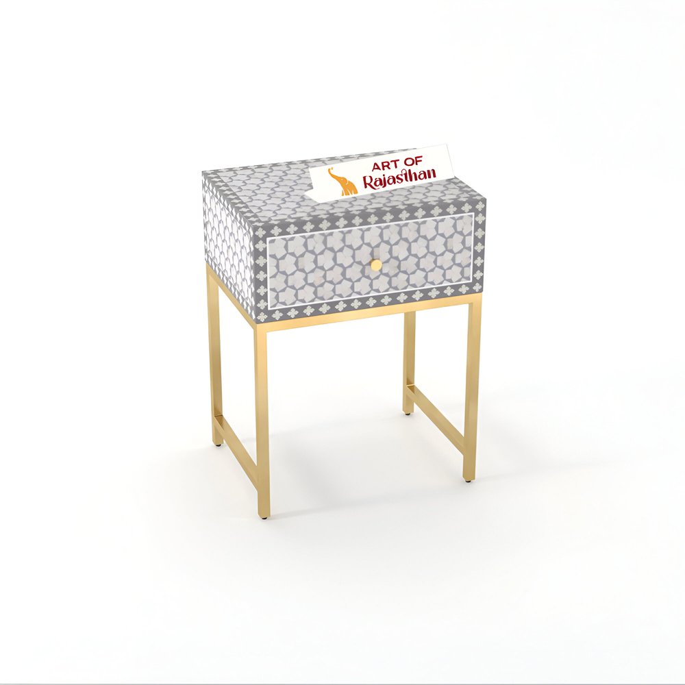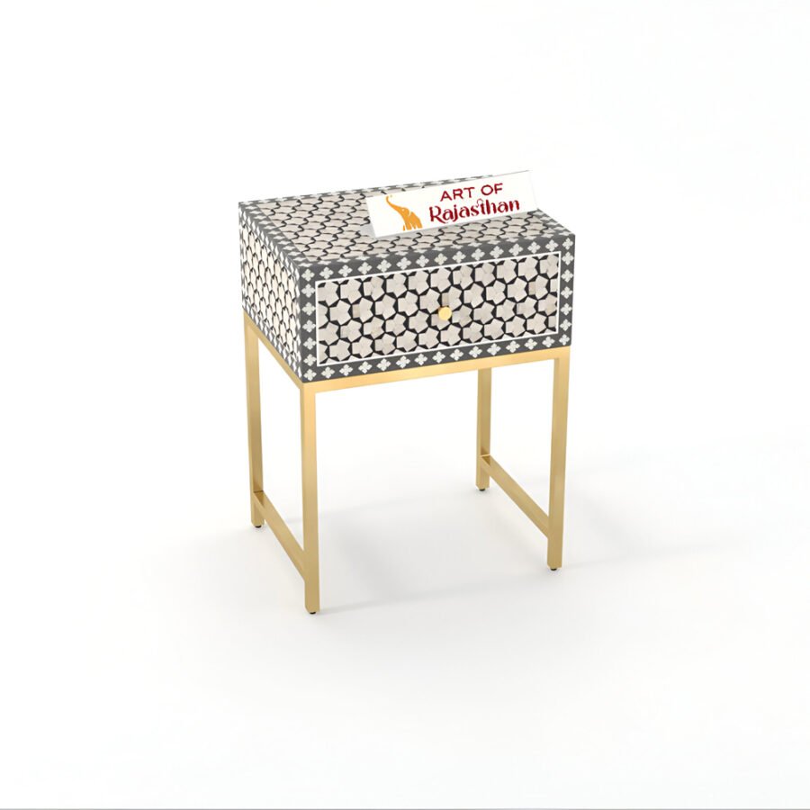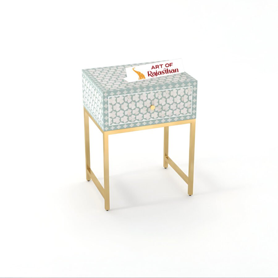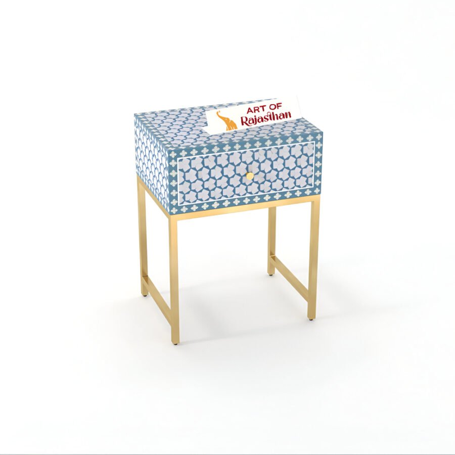 Transform your space with the Bone Inlay Beside Table with Metal Legs – TARGUA by Art of Rajasthan. This stunning table combines intricate bone inlay and mother of pearl designs with durable metal legs for a modern, yet timeless look. Available in Black, White, Grey, Teal Green, Teal Blue, and Indigo, it perfectly complements any décor. Dimensions: L 45 x D 35 x H 60 cm. Ideal for adding elegance and functionality to your bedroom or living room.