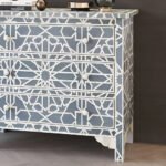 Bring home the essence of luxury with the Bone Inlay Chest of 3 Drawers – Elegant Cyrus by Art of Rajasthan. Showcasing a regal Cyrus-inspired design in a rich silver slate grey, this handcrafted piece exudes timeless grace and modern elegance. Crafted from bone inlay, mother of pearl, resin, and sturdy engineered wood, its W95 x D45 x H85 cm frame offers refined storage wrapped in artisanal beauty.