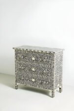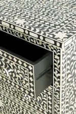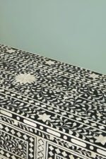 Elevate your space with the unmatched charm of the Art of Rajasthan‘s handcrafted Bone Inlay Chest of 3 Drawers. Featuring an intricate floral black and white design, this stunning piece blends heritage craftsmanship with modern elegance. Meticulously crafted using ethically sourced bone inlay, mother of pearl, and resilient resin set in engineered wood, it offers both durability and sophistication. The classic monochrome palette makes it a versatile statement piece, perfect for any interior style.