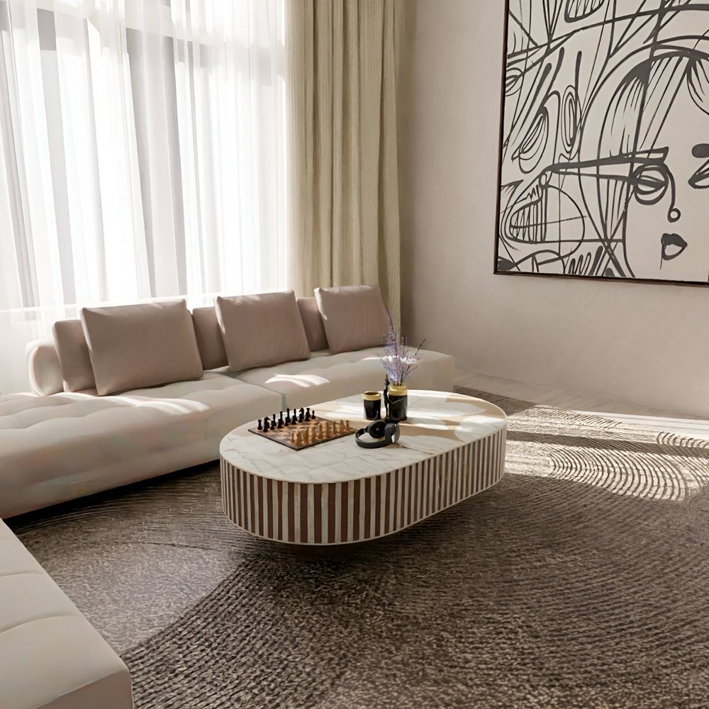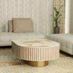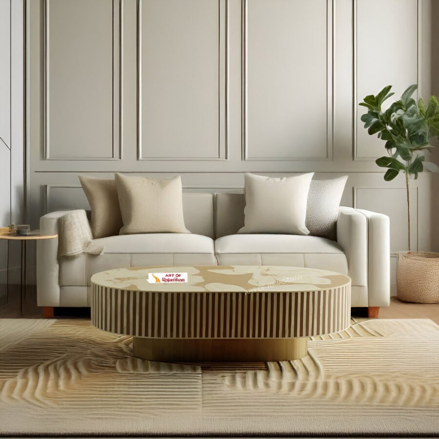 Bring blooming elegance into your home with the Hibiscus Floral Bone Inlay Oval Coffee Table by Art of Rajasthan. Featuring a beautifully detailed hibiscus-inspired floral pattern, this handcrafted piece is made using exquisite bone inlay, mother of pearl, smooth resin, and finished with radiant brass accents. The refined oval shape and organic color palette—Walnut Brown, Ivory White, and Sandy Beige—create a warm, inviting centerpiece that adds artisanal charm to any room. Perfectly sized at L105 x D70 x H45 cm. Lush Floral Detailing, Elegant, Earth-Toned Finish, Handcrafted Luxury with Lasting Beauty