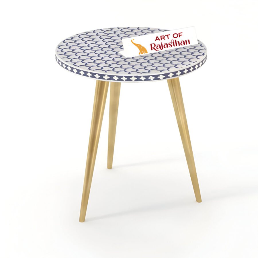Enhance your home decor with the Bone Inlay Round Side Table with Three Metal Legs – Targua by Art of Rajasthan. Featuring a beautifully detailed bone inlay and mother of pearl design, this table combines elegance with functionality. The sturdy three-metal-leg base adds a contemporary touch to the timeless craftsmanship. Made from premium materials like resin, MDF wood, and brass, it offers both style and durability. Available in a range of sophisticated colors – Black, White, Grey, Teal Green, Teal Blue, and Indigo – this side table is perfect for any modern living space. Dimensions: Dia. 50 x H. 55 (CM).