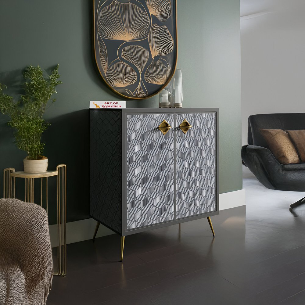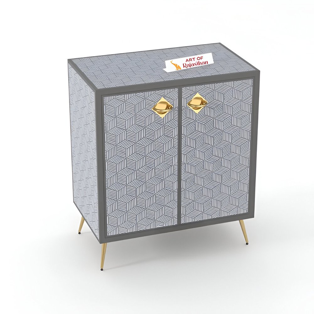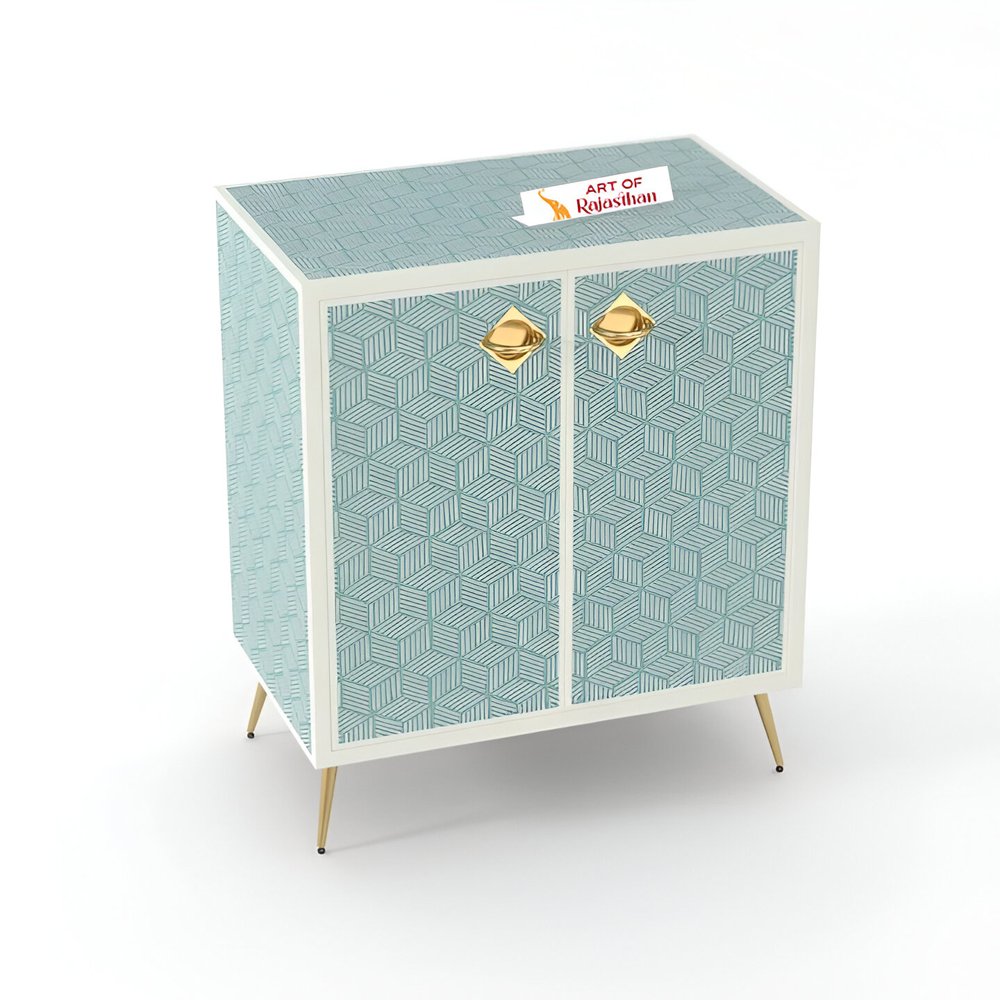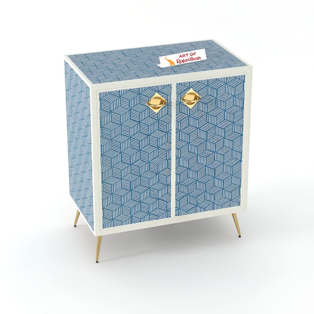 Bone Inlay 2 Door Storage Cabinet – Diamond Floral | Art of Rajasthan Turn your space into a masterpiece with the Bone Inlay 2 Door Storage Cabinet – Diamond Floral by Art of Rajasthan. This stunning piece showcases a luxurious diamond floral motif, meticulously handcrafted with bone inlay, mother of pearl, and resin, all set on durable engineered wood with elegant brass accents. A perfect harmony of timeless craftsmanship and modern elegance, this cabinet adds both style and smart storage to any room. Intricate design that radiates refined beauty. Functional Luxury: Spacious 2-door storage keeps essentials organized in style.
