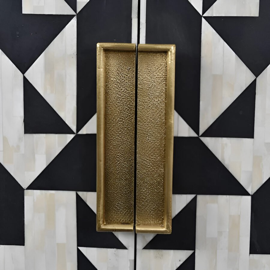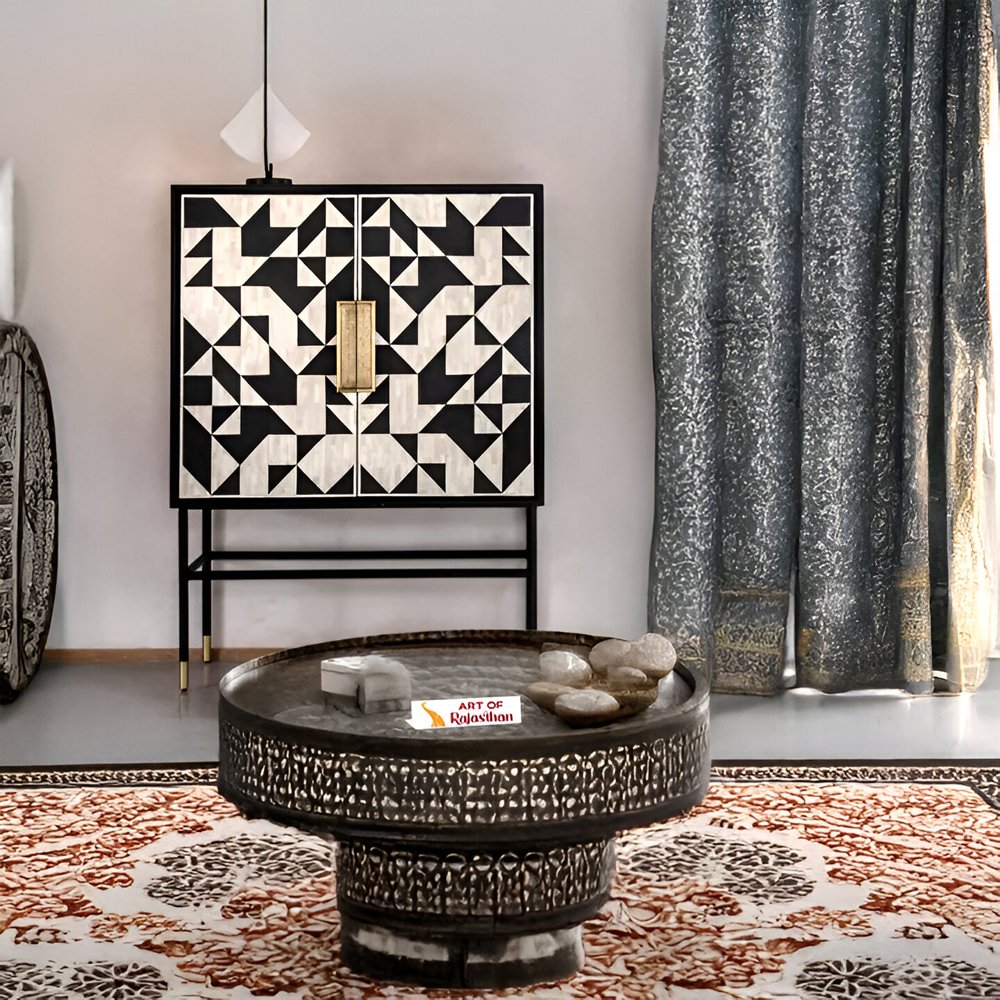Make a majestic impression with the Bone Inlay Storage Cabinet – Kingsley by Art of Rajasthan. Standing tall with grace, this elegant cabinet is handcrafted with intricate bone inlay and shimmering mother of pearl, set in smooth resin and reinforced with sturdy engineered wood. Adorned with brass accents and available in Classic Black and White, it offers generous vertical storage while doubling as a luxury décor statement. Perfect for sophisticated living rooms, bedrooms, or hallways. Dimensions: W100 x D40 x H140 cm Material: Bone Inlay, Mother of Pearl, Resin, Engineered Wood, Brass Color Options: Classic Black, White