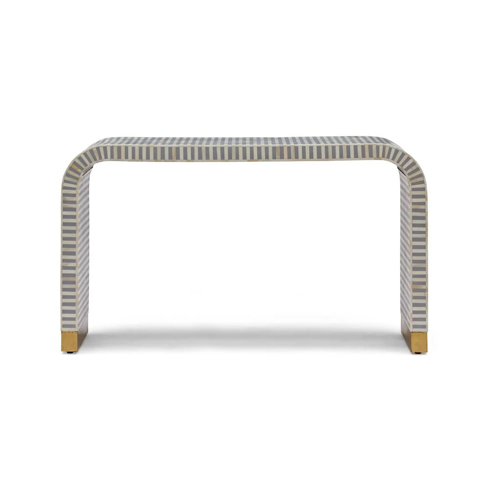 Introduce refined elegance to your interiors with this Bone Inlay Console Table featuring a sleek grey finish and sturdy metal base. Expertly handcrafted by skilled artisans, this console table showcases intricate bone inlay detailing that adds texture, depth, and a sophisticated visual appeal.