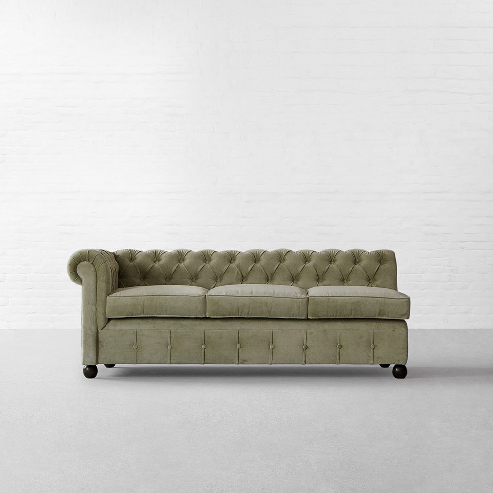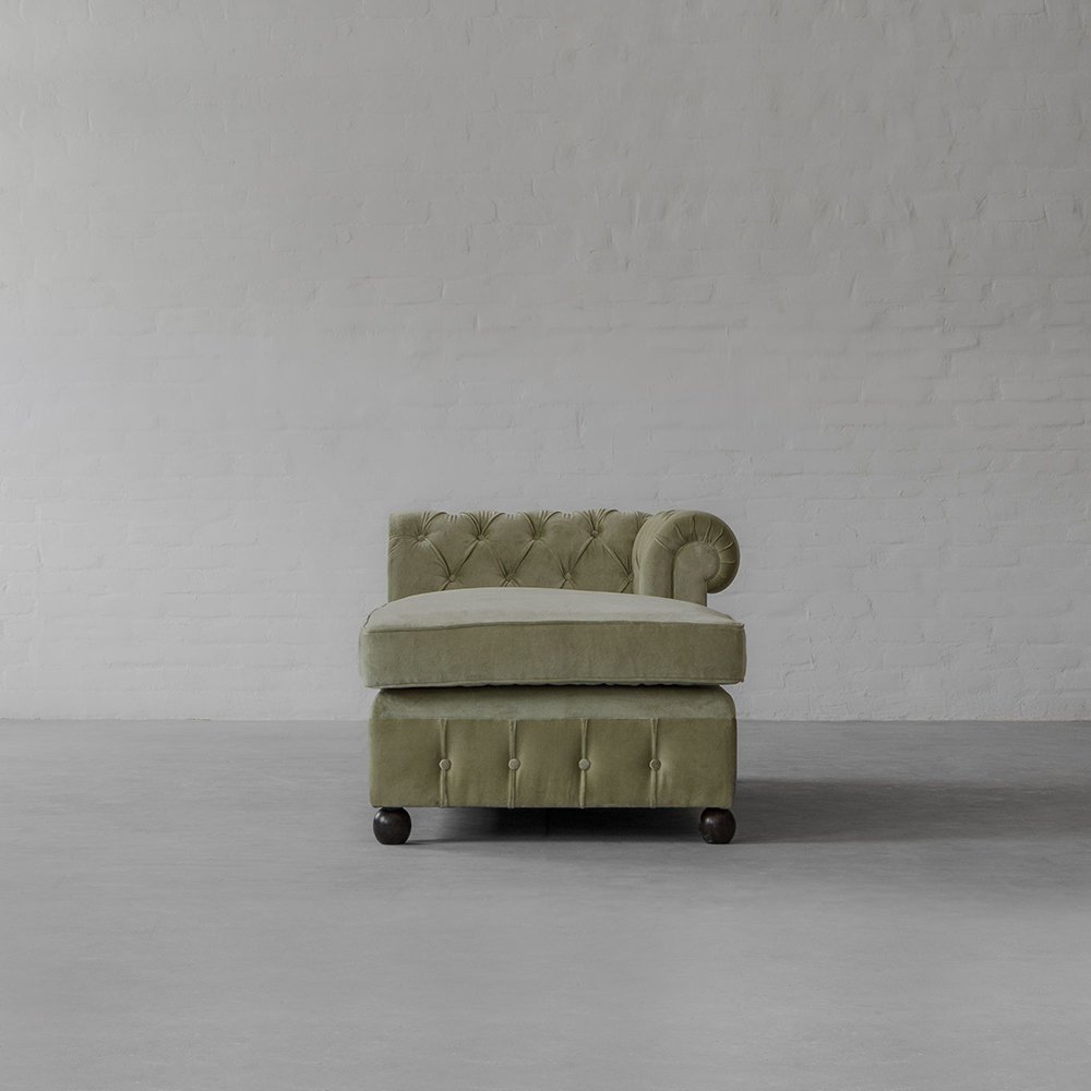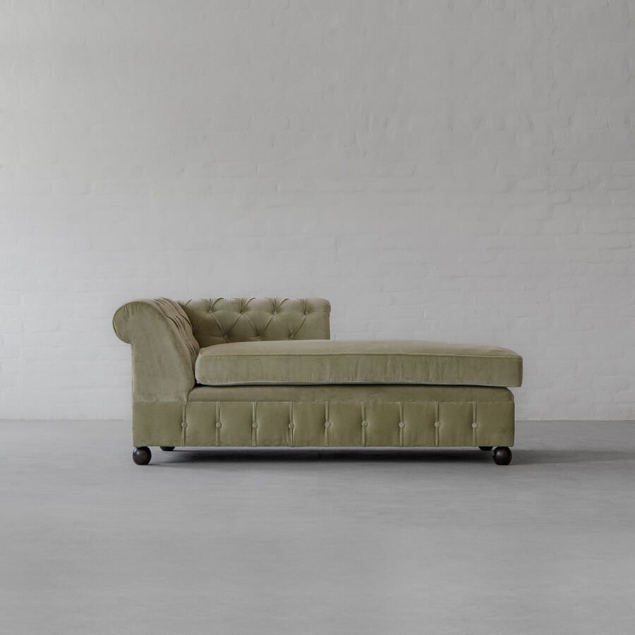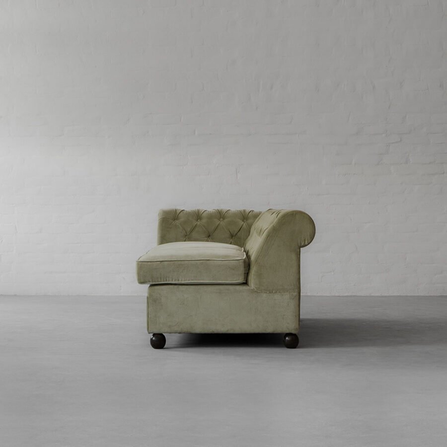 Add timeless elegance to your home with the Luxury Chesterfield Tufted Sectional Sofa by Art of Rajasthan. Expertly handcrafted in premium cotton velvet sage fabric for a soft, opulent feel. The deep button tufting, grand silhouette, and chaise design offer both comfort and regal charm. Available in rich shades like Olive, Dusk Blue, Blush, and Indigo to match any luxurious space.