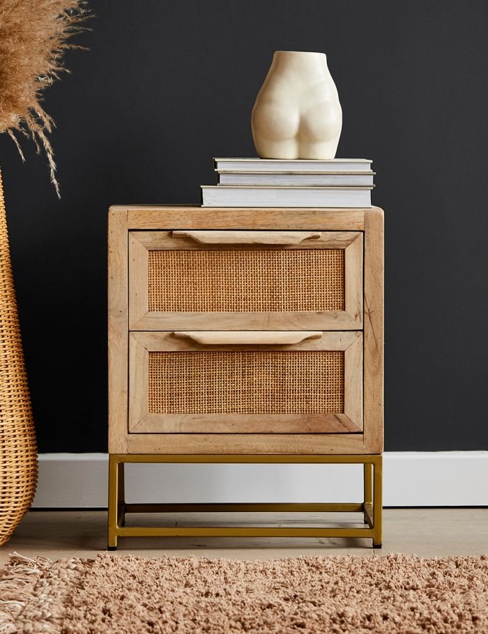 Mango Wood Cane Bedside Table – 2 Drawer Natural Finish