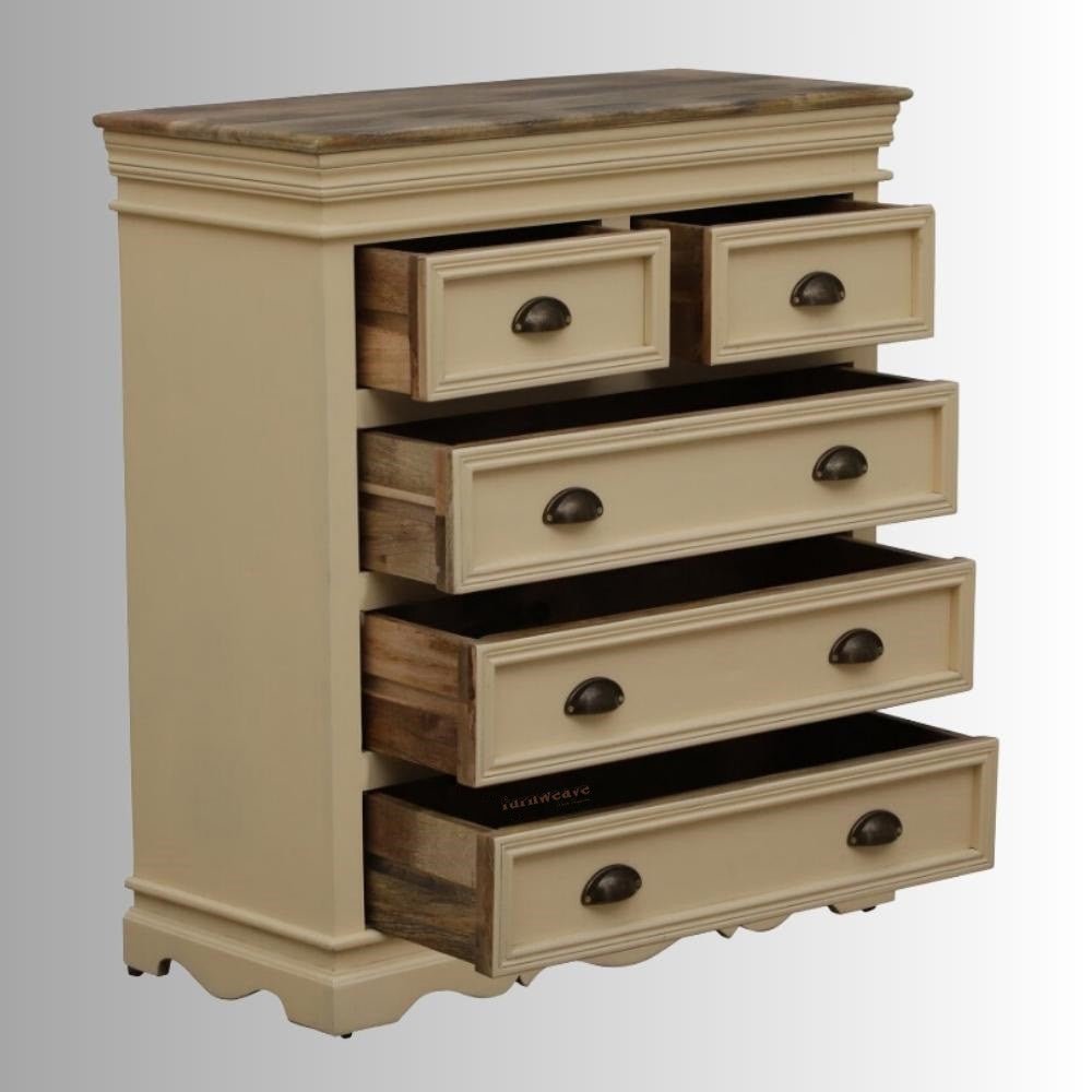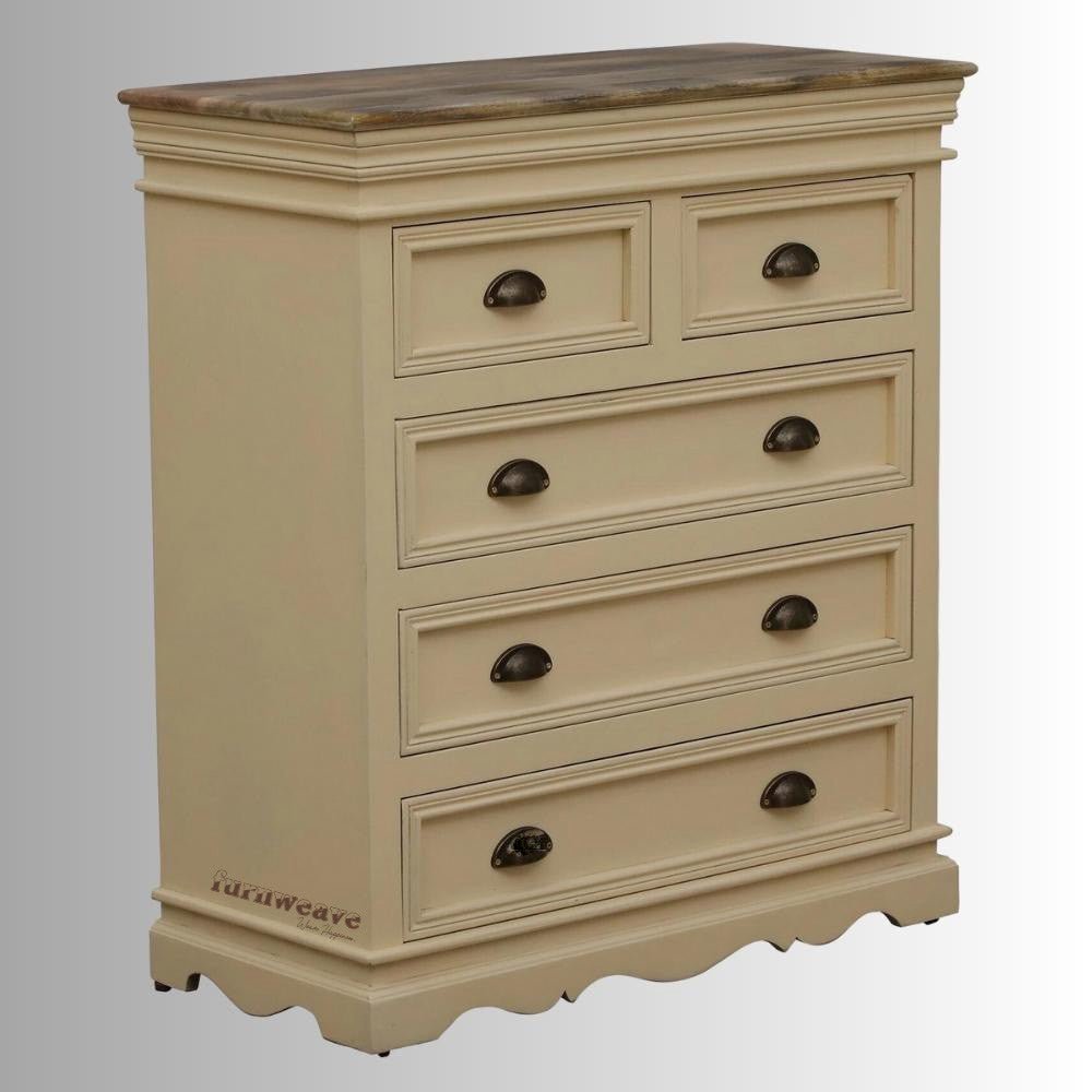 Add timeless elegance to your interiors with this Mango Wood Chest of Drawers featuring a refined Antique Cream Distressed Finish. Crafted from solid mango wood, this chest showcases a soft vintage character with subtle distressing that enhances its handcrafted appeal.