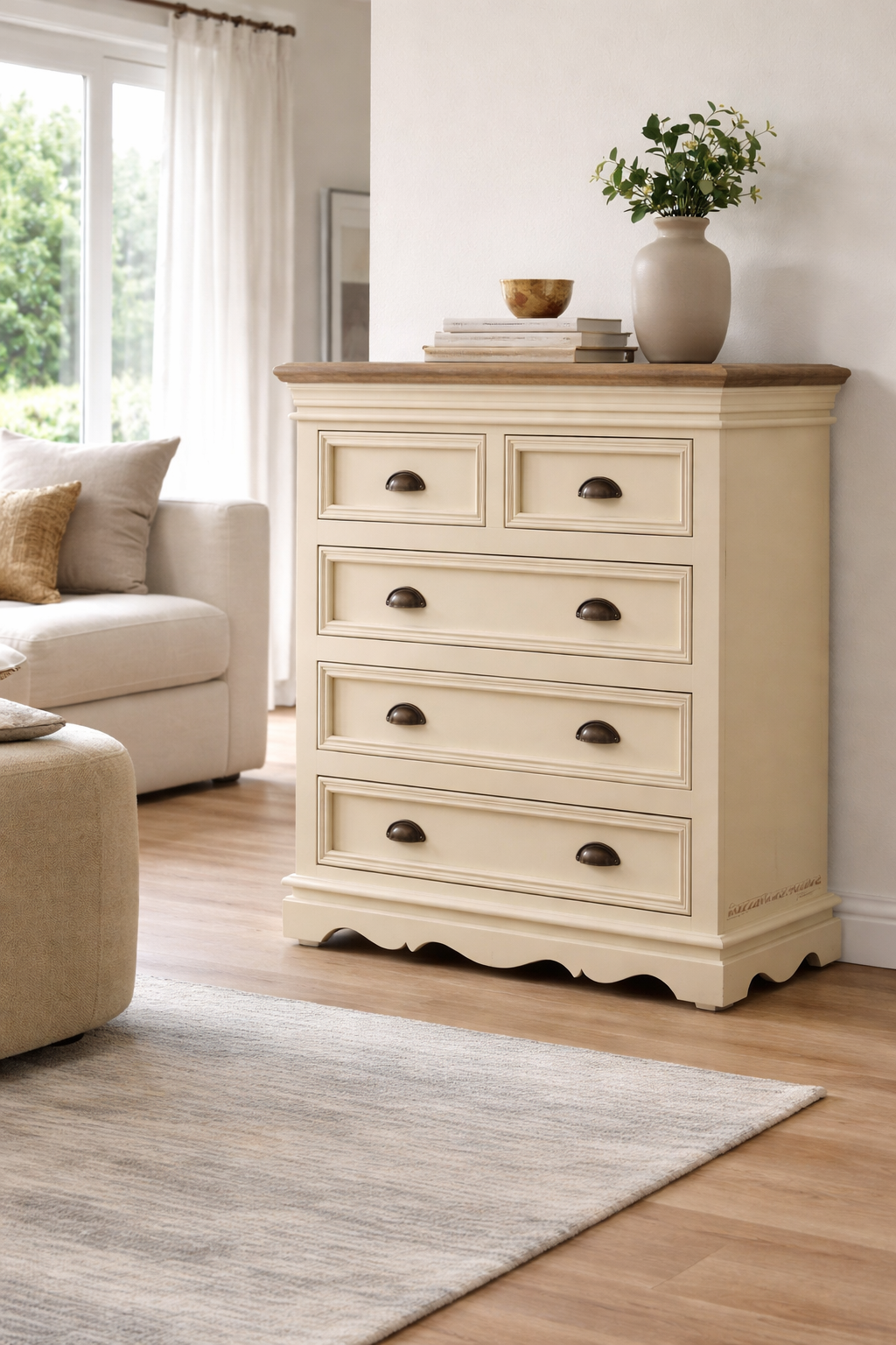 Designed with four spacious drawers, it offers practical storage for clothes, linens, accessories, or essentials while maintaining a clean and elegant look. The antique cream tone blends beautifully with modern, classic, and farmhouse-style interiors, making it an ideal choice for bedrooms, living rooms, or entryways.