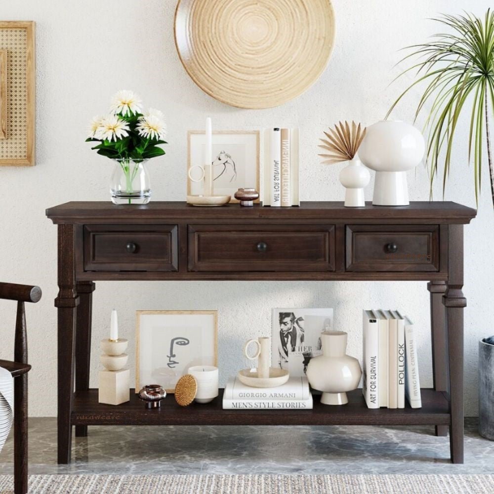 Bring refined storage and timeless style into your home with this mango wood console table featuring three spacious drawers. Crafted from high-quality solid mango wood, this piece is designed for durability while showcasing a rich walnut finish that adds warmth and sophistication.