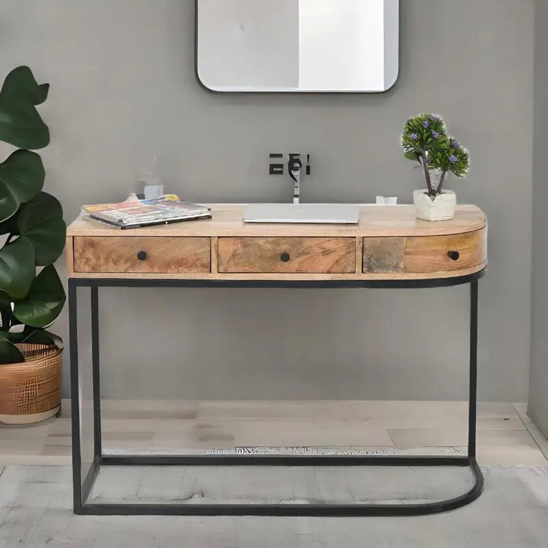 Mango Wood Console Table with 3 Drawers & Iron Stand