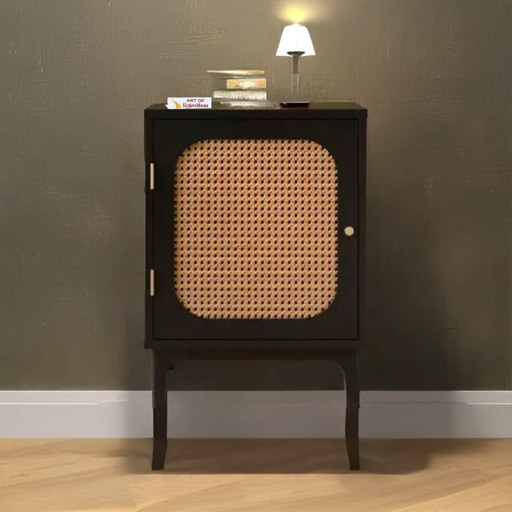 Upgrade your bedroom with this mango wood rattan bedside table in a sleek black finish. Crafted from solid mango wood, it features a handwoven cane panel and a smooth-glide drawer for bedside essentials. The minimalist design blends modern and boho interiors while offering durability, style, and everyday functionality.