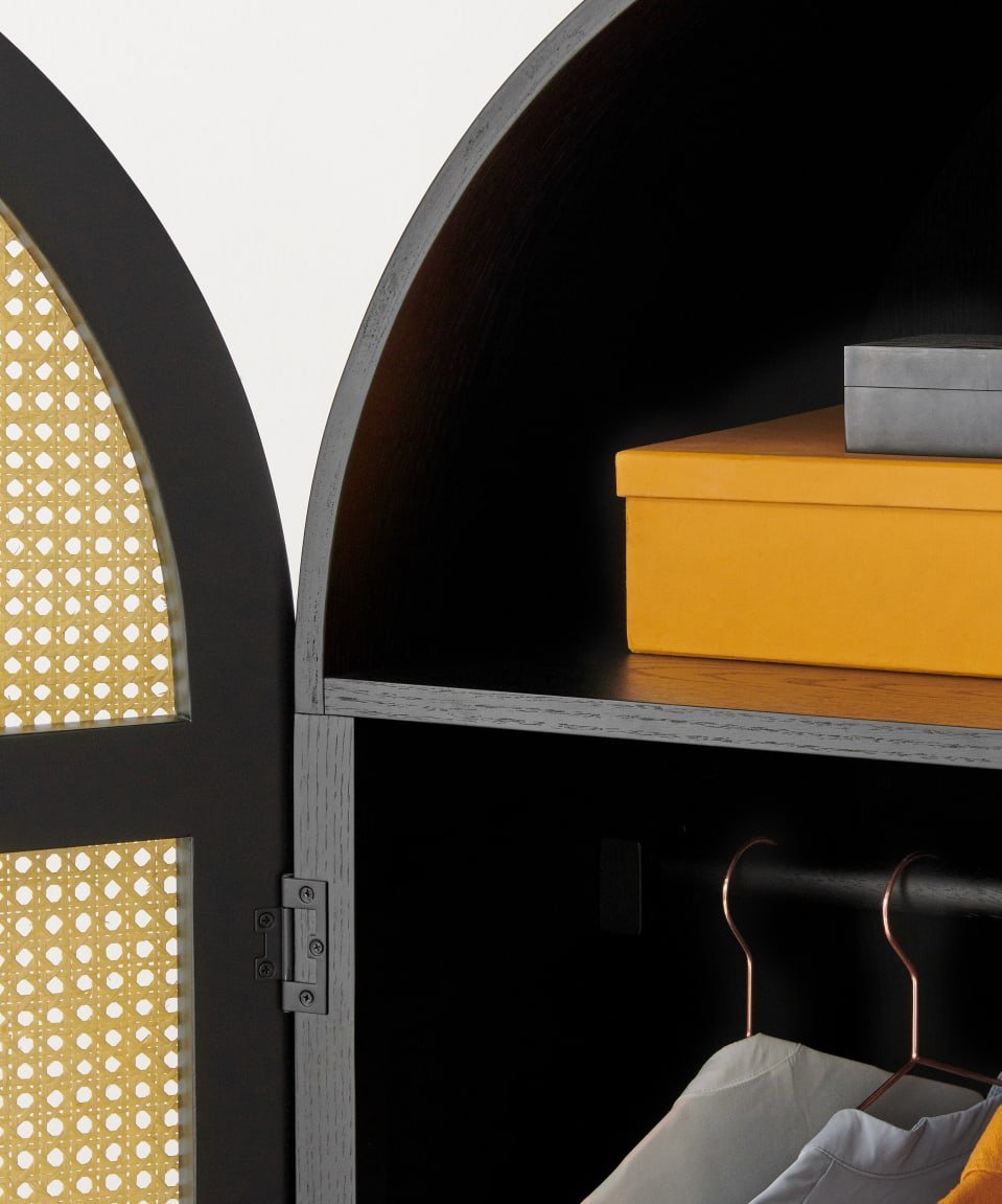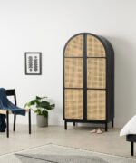 The smooth curved silhouette softens the overall design, creating a refined and modern aesthetic. The rich black finish enhances its sophisticated look, while the rattan detailing adds a handcrafted texture and breathable design element. The spacious interior provides organized storage for clothing, accessories, and daily essentials.