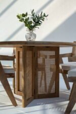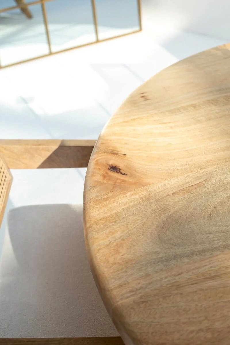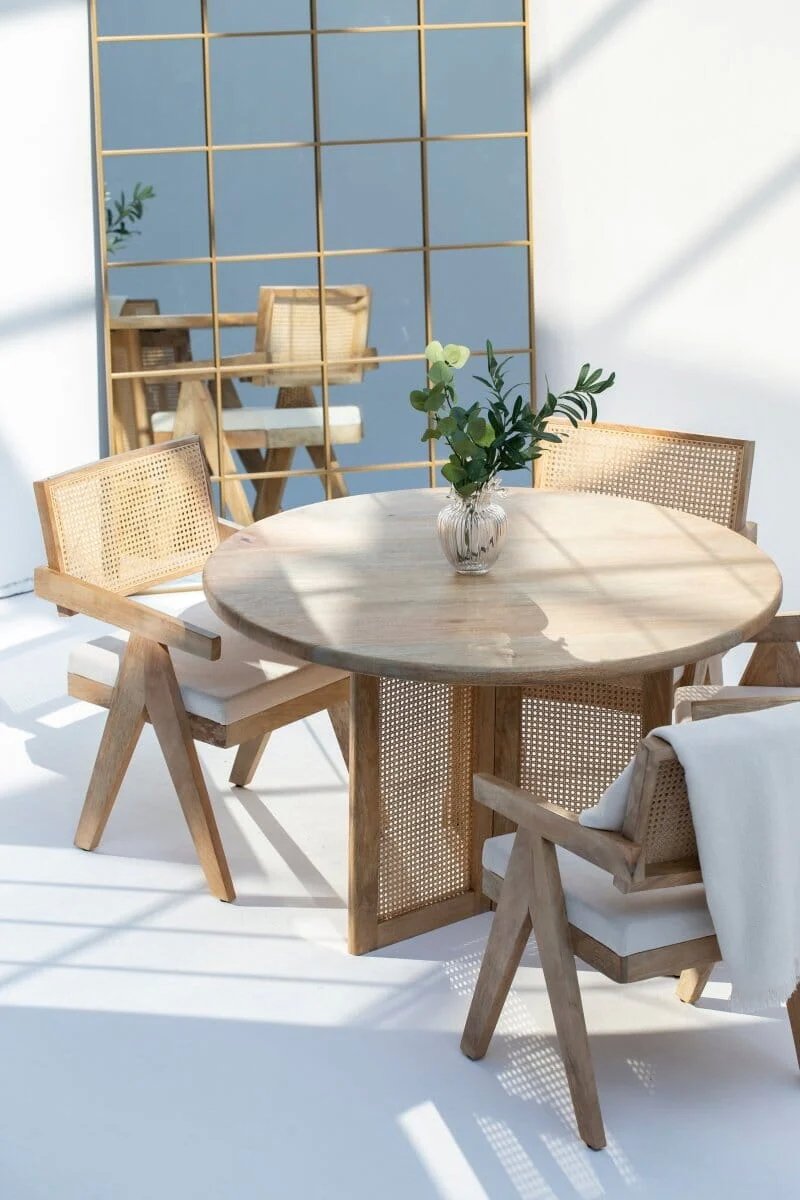 The smooth natural finish enhances the wood’s rich grain texture, while the cane detailing adds a stylish and breathable design element. Its round shape makes it ideal for compact dining spaces, encouraging comfortable seating and easy conversation for up to four people.