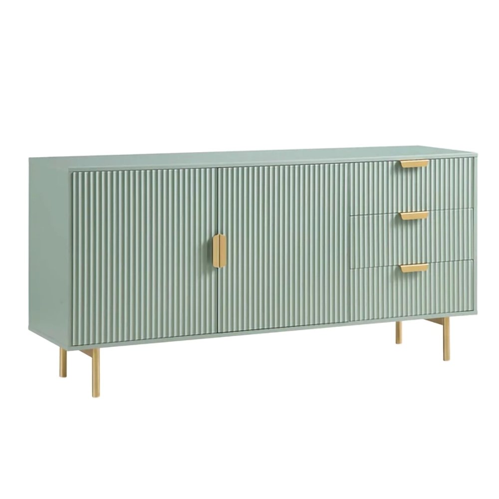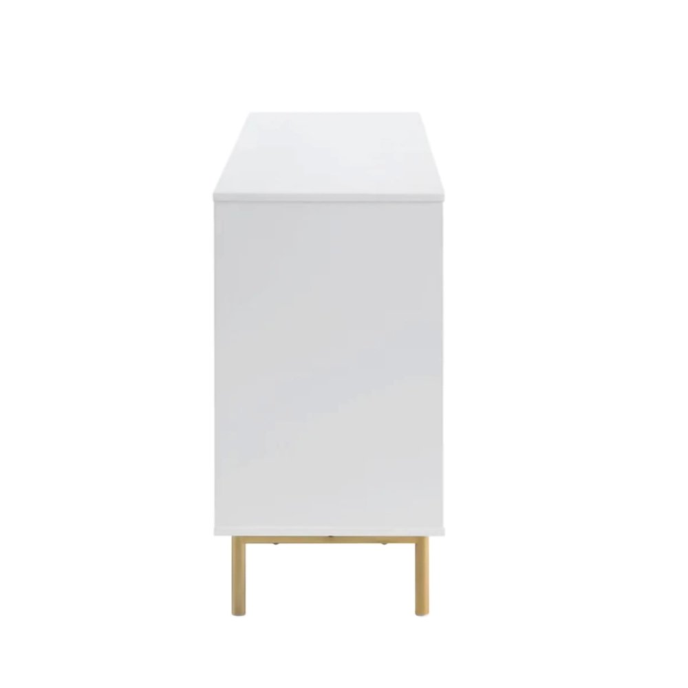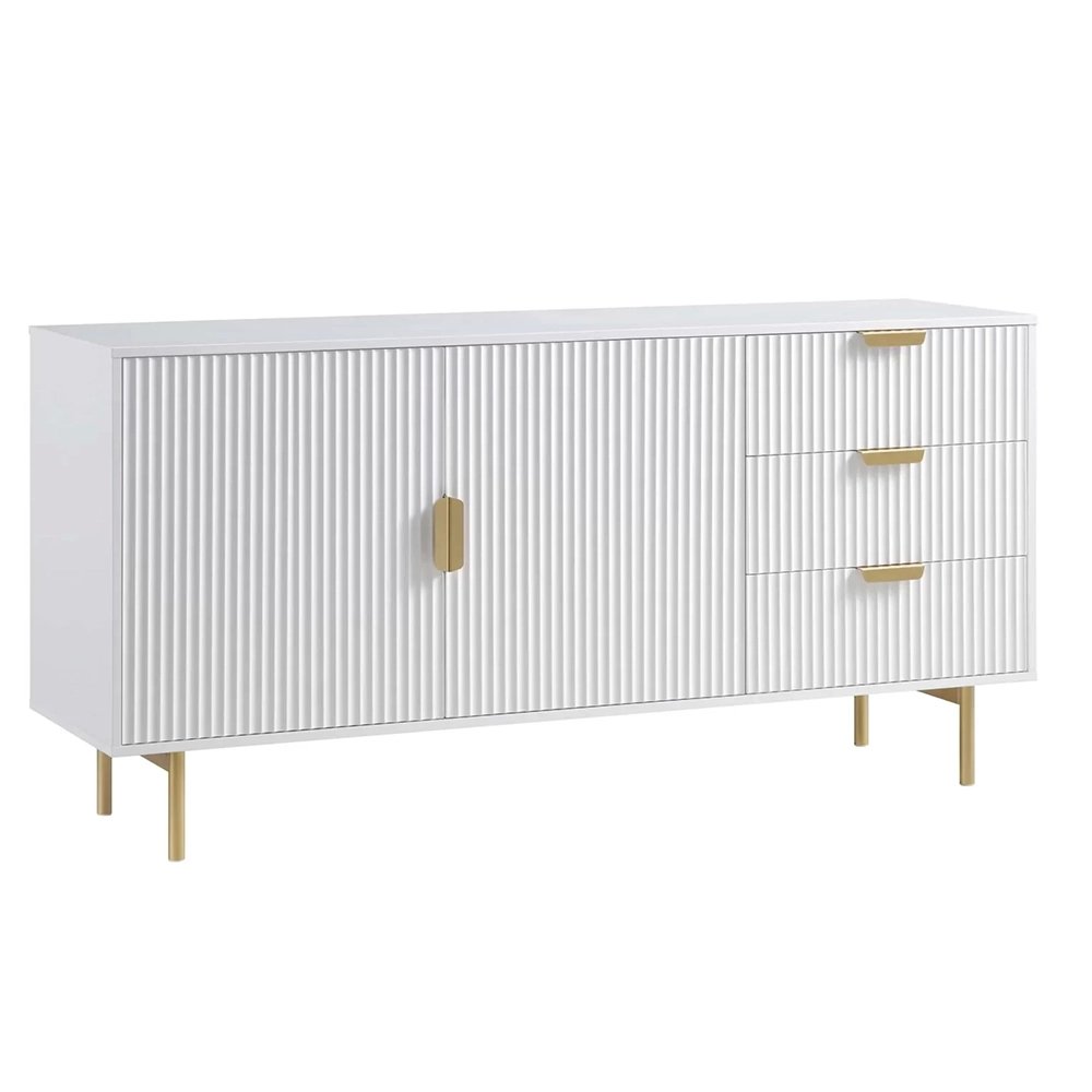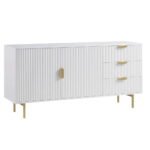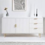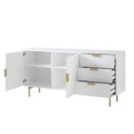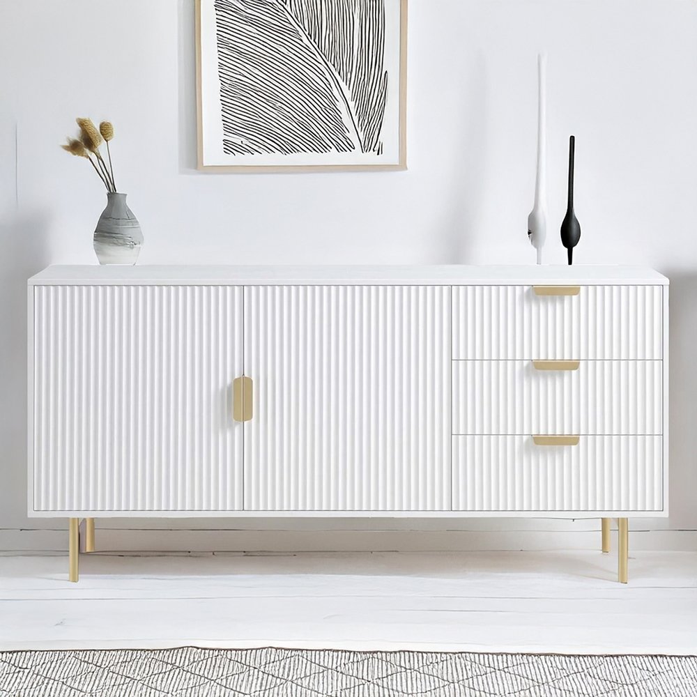 This sideboard features three smooth-glide drawers and a spacious two-door cabinet, offering organized storage for dinnerware, barware, accessories, linens, or décor essentials. The sturdy wood construction ensures long-lasting durability, while the modern minimalist silhouette makes it a standout statement piece for luxury homes.