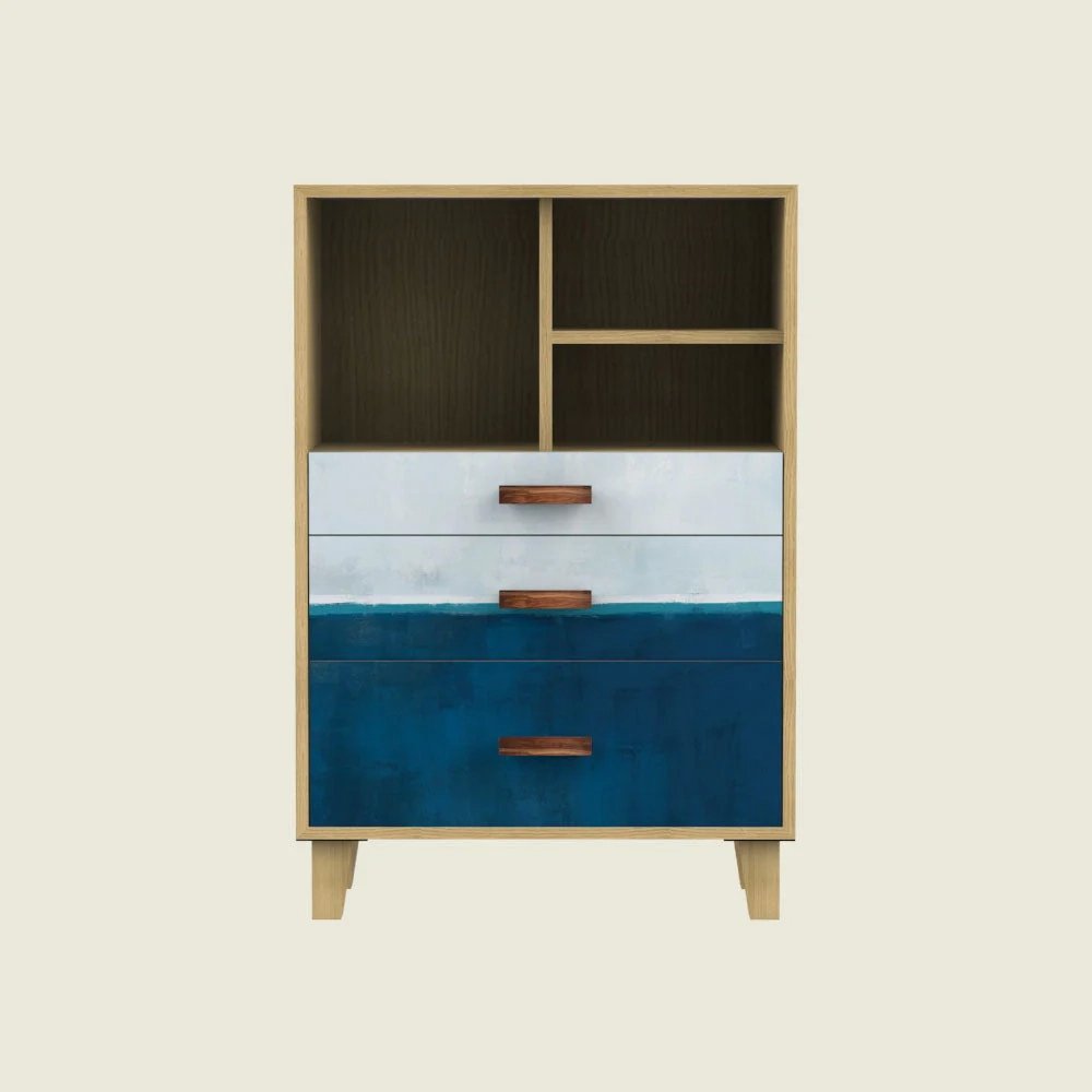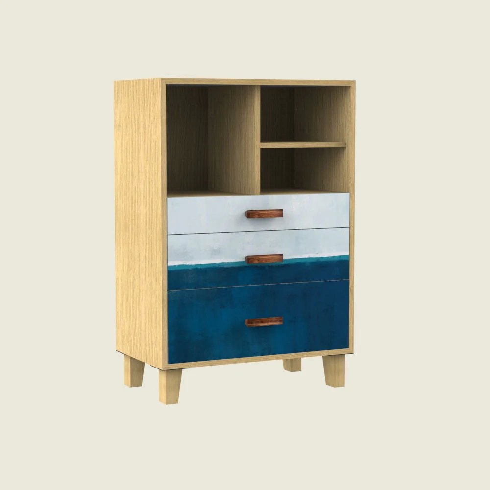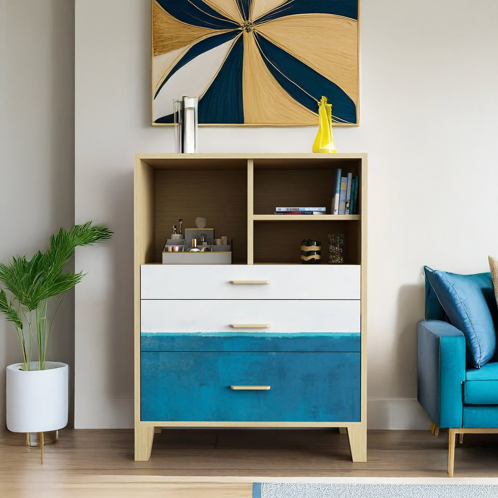 Upgrade your home with this Modern Blue & White Chest of Drawers, designed with a refreshing gradient finish that brings a stylish and contemporary look to any room. Crafted with a natural wood frame, this chest features three spacious drawers for clothing, accessories, and household essentials, along with open top shelves perfect for décor, books, or storage baskets.