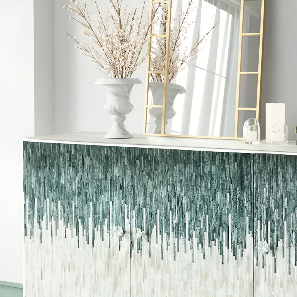 Add a bold burst of modern sophistication to your interiors with the Green Abstract Bone Inlay Sideboard by Art of Rajasthan. Handcrafted with a striking mix of mother of pearl, bone inlay, and rich green resin, this piece showcases a unique abstract design that blends art, texture, and timeless form. Set in engineered wood with brass accents and finished in rustic light off-white, this statement sideboard (L177 x D45 x H84 CM) delivers luxury storage and eye-catching elegance.