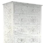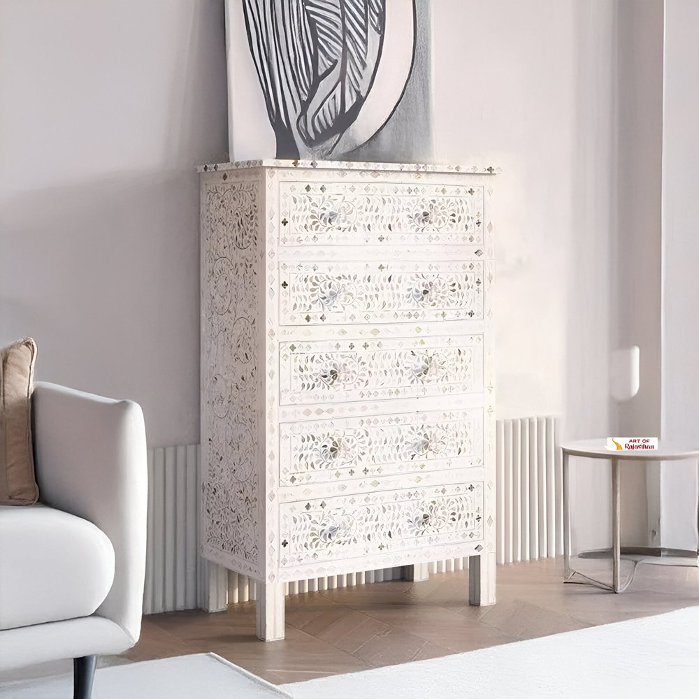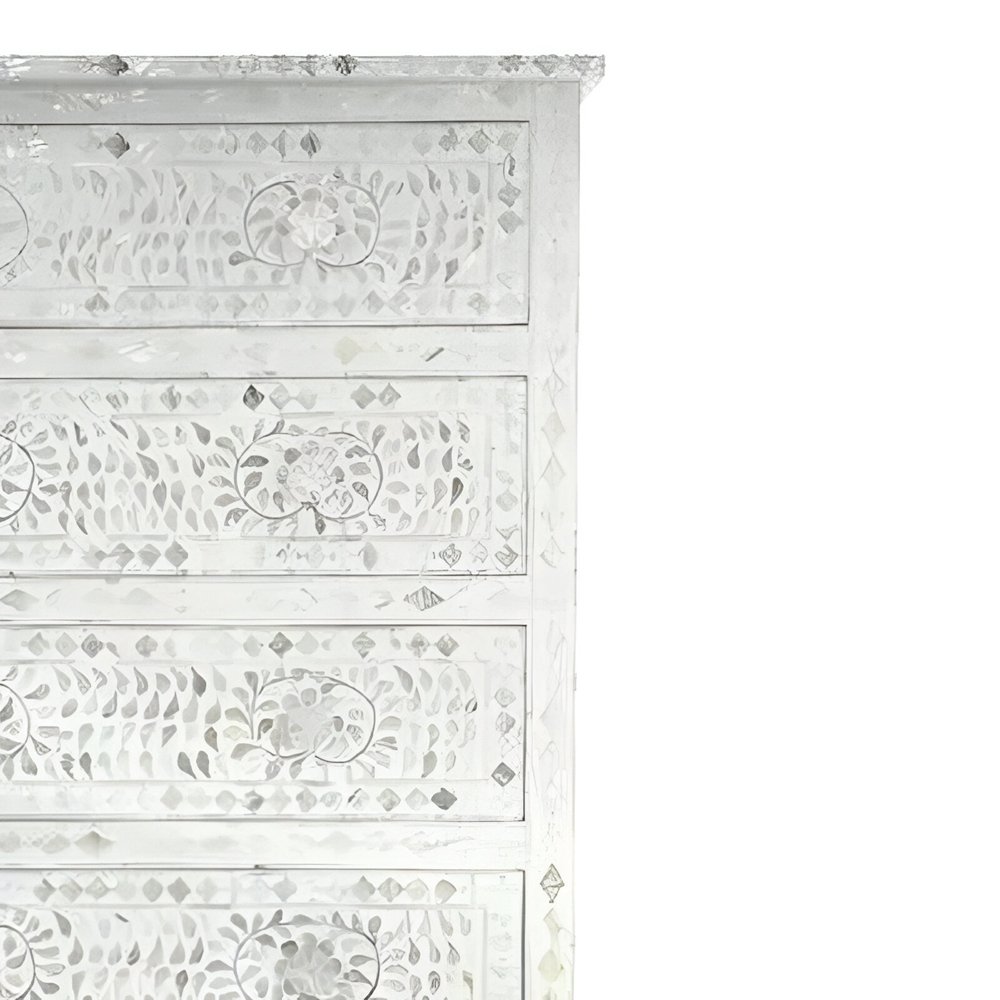 By Art of Rajasthan. Refine your space with the timeless beauty of this Mother of Pearl Inlay Tallboy Chest. Featuring an elegant off-white finish with soft pearl gold accents, this handcrafted piece brings subtle luxury and graceful storage into any room. Made with shimmering mother of pearl, smooth resin, and durable engineered wood, it offers five spacious drawers in a slim, space-saving silhouette—perfect for bedrooms, entryways, or refined corners.