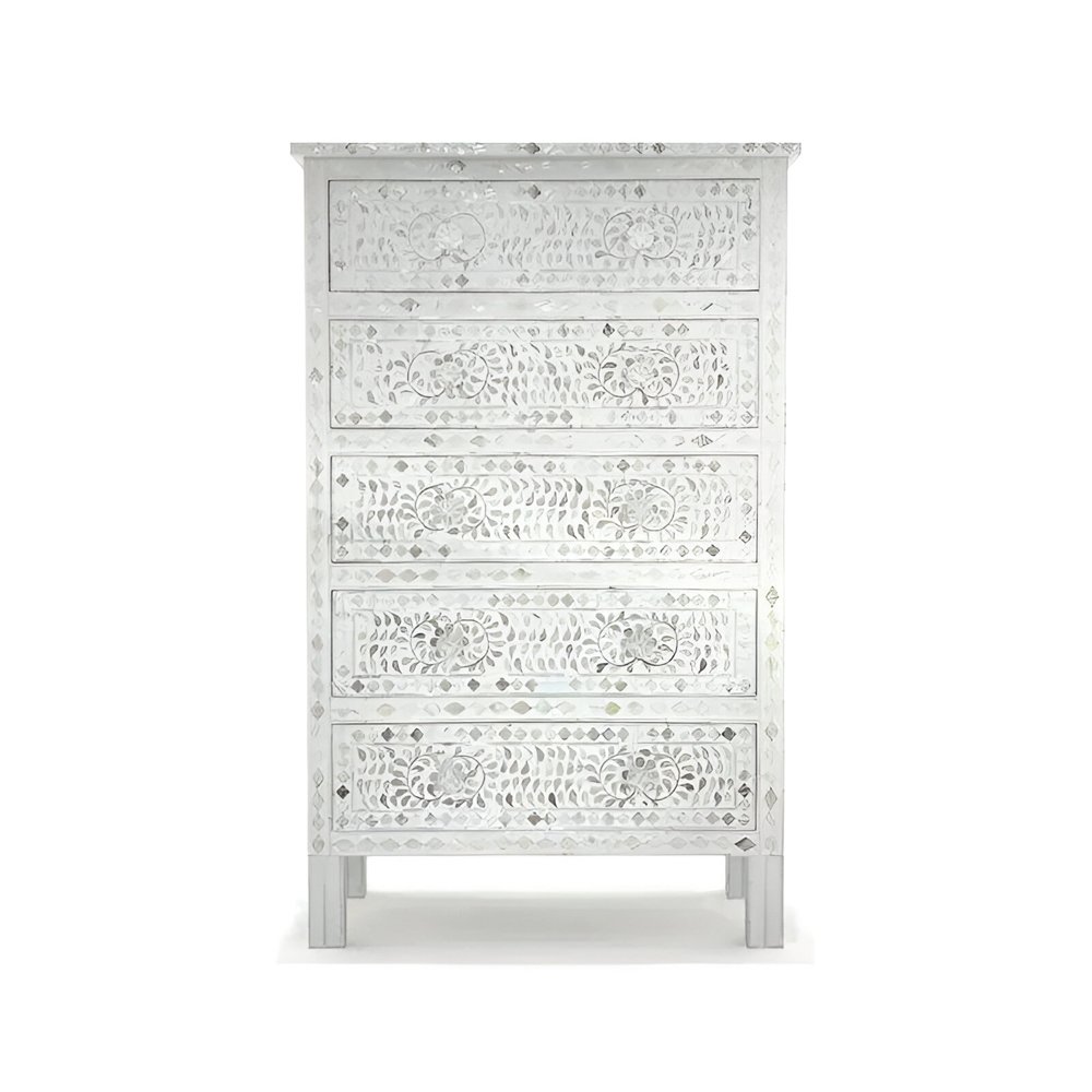 Mother of Pearl Inlay Chest of 5 Drawers Tallboy – Off white