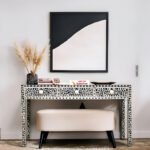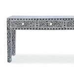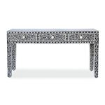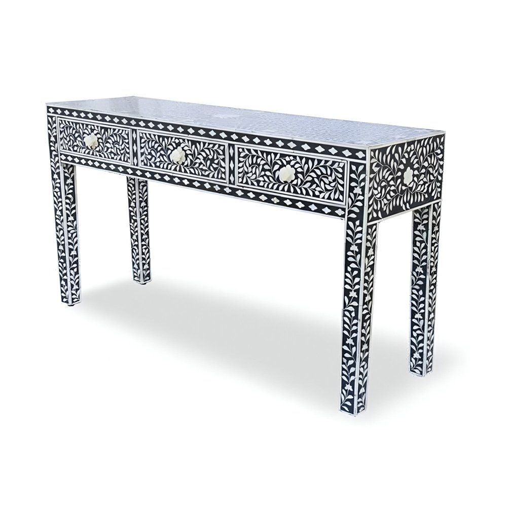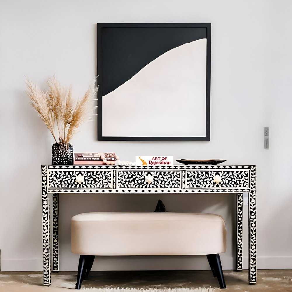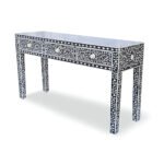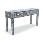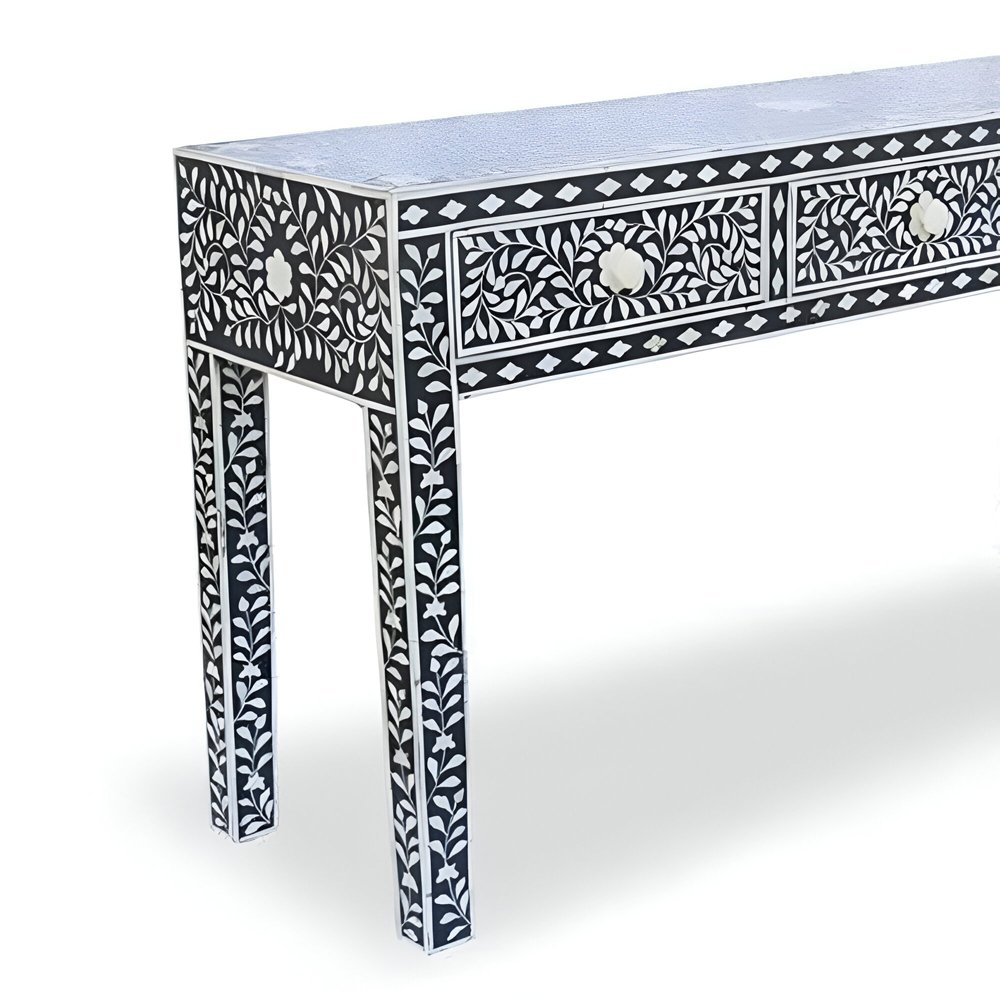 Elevate your decor with the Mother of Pearl Inlay Console Table – Floral Black by Art of Rajasthan. This striking piece features intricate bone inlay and mother of pearl floral patterns set against a bold black background. Crafted with high-quality resin and MDF wood, it combines artistry with durability, making it a perfect addition to any entryway or living space. Dimensions: W120 x D40 x H80 cm Materials: Bone Inlay, Mother of Pearl, Resin, MDF Wood Colors: Black | White.