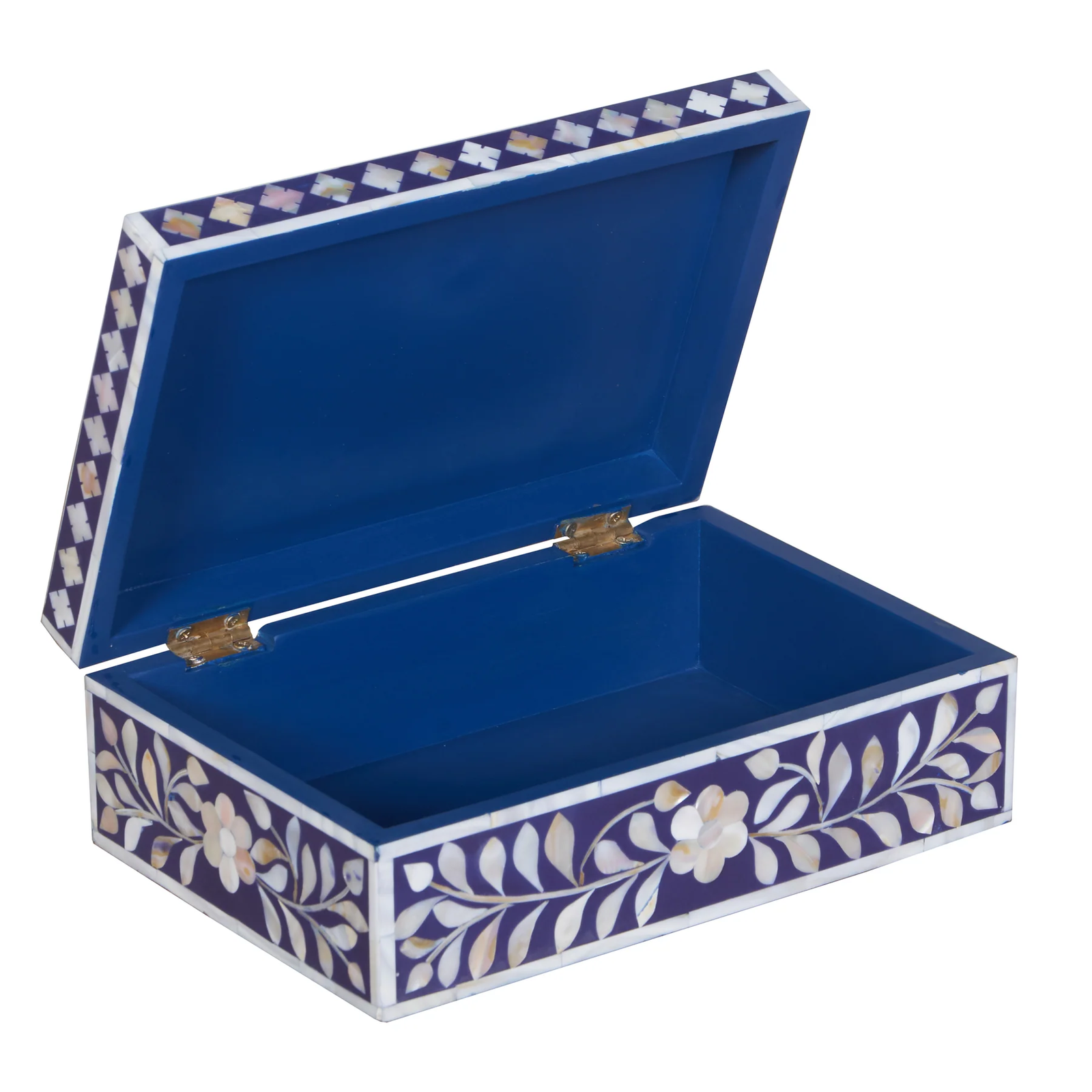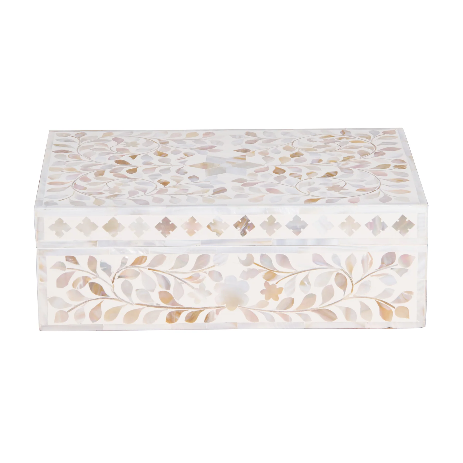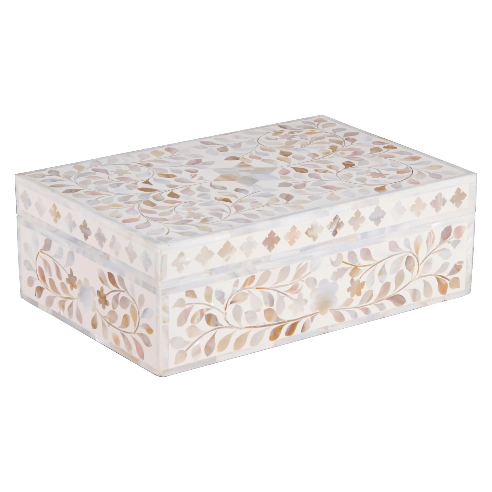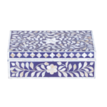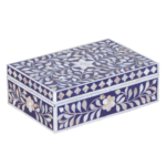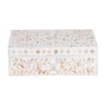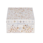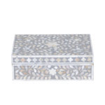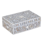 Add subtle elegance to your storage with this mother of pearl inlay rectangular jewellery box, featuring a refined grey floral design. Handcrafted by skilled artisans, this decorative box showcases intricate inlay work using genuine mother of pearl, creating a soft shimmer and sophisticated finish.