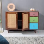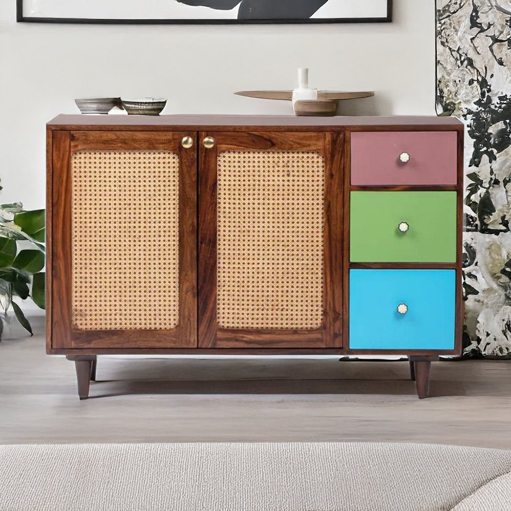 Elevate your home décor with this Multicolor Wood Sideboard featuring Cane 2 Doors, a perfect blend of natural texture, vibrant tones, and modern craftsmanship. The cabinet showcases two beautifully woven cane-panel doors paired with three colorful drawers in pink, green, and blue—adding a fresh, playful, and contemporary vibe to any interior.