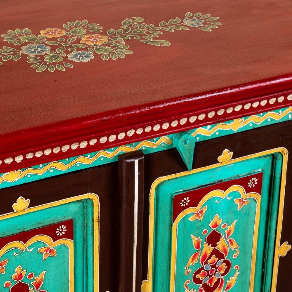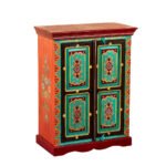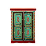 Made from high-quality solid wood, the cabinet includes four beautifully painted doors that open to spacious storage, perfect for organizing home essentials, décor pieces, linens, books, or pooja items. The handcrafted detailing enhances its cultural appeal while the vibrant palette brings life and personality to modern as well as traditional interiors.