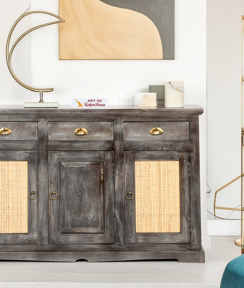 Elevate your home with this Rustic Grey Wooden Sideboard, blending distressed craftsmanship with modern natural cane paneling. The rich grey finish gives it a vintage farmhouse appeal, while the woven cane inserts add warmth, texture, and organic charm—making this sideboard a stylish focal point in any living room, dining space, or hallway.