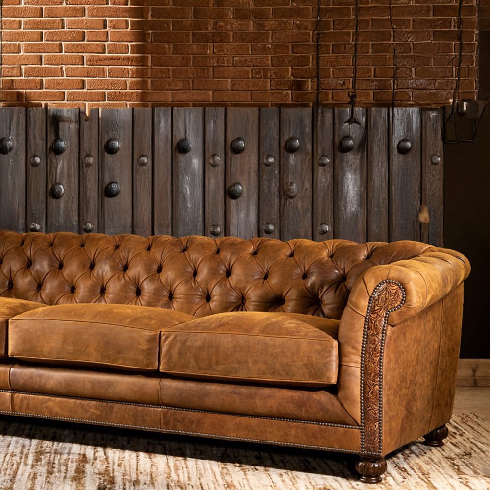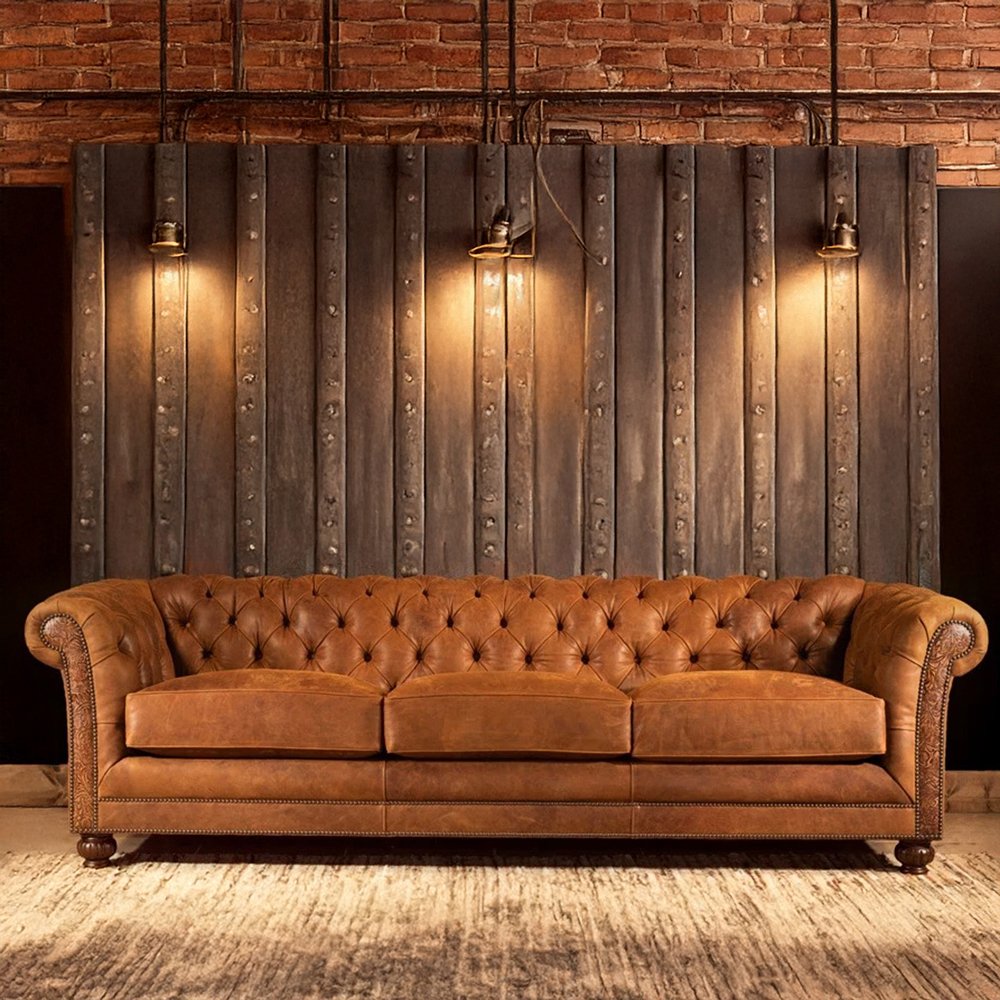 The Saviero 4-Seater Chesterfield Sofa by Art of Rajasthan features golden brown genuine leather upholstery, deep button tufting, a solid wood inner frame, and sleek metal legs. A bold blend of timeless design and artisan craftsmanship — made to elevate any living space.