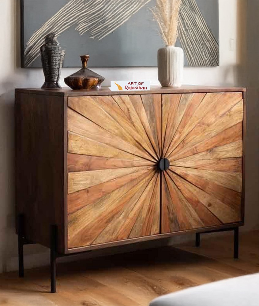 Add warmth and artistic elegance to your interiors with this stunning Sheesham wood 2 door sideboard featuring a sunburst design. Expertly crafted from 100% solid Sheesham wood, this sideboard highlights the natural grain and rich tones of the wood, enhanced by an eye-catching sunburst pattern that brings character and depth to your space.
